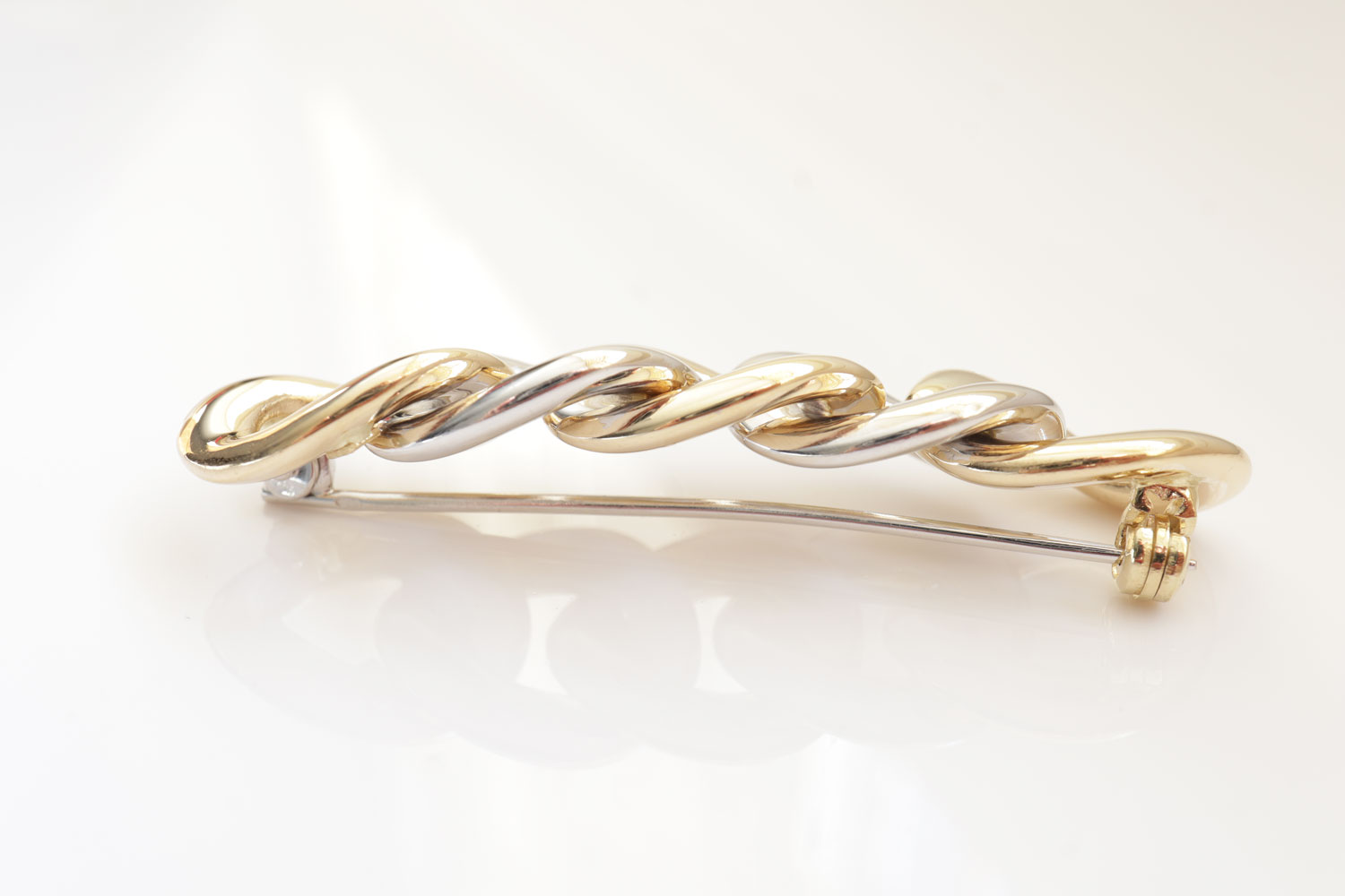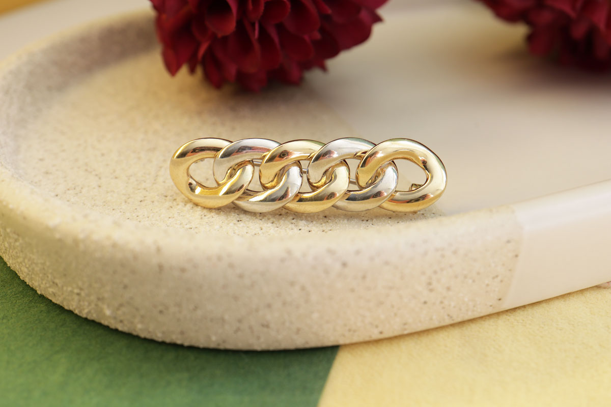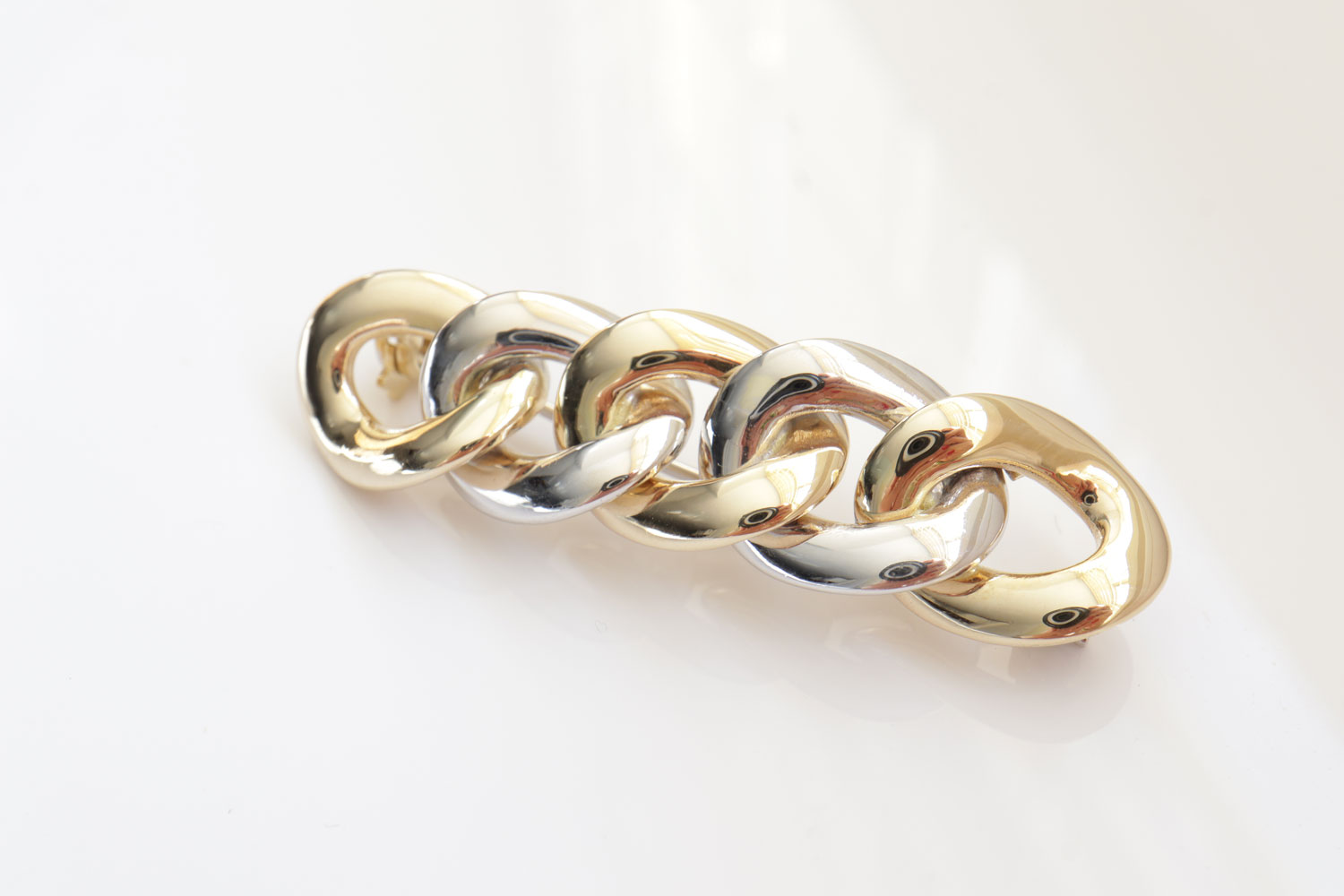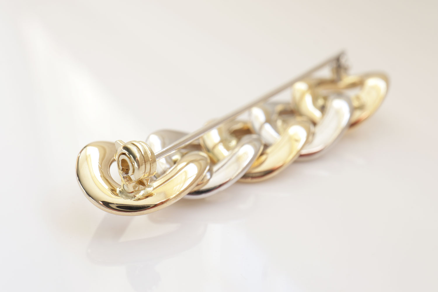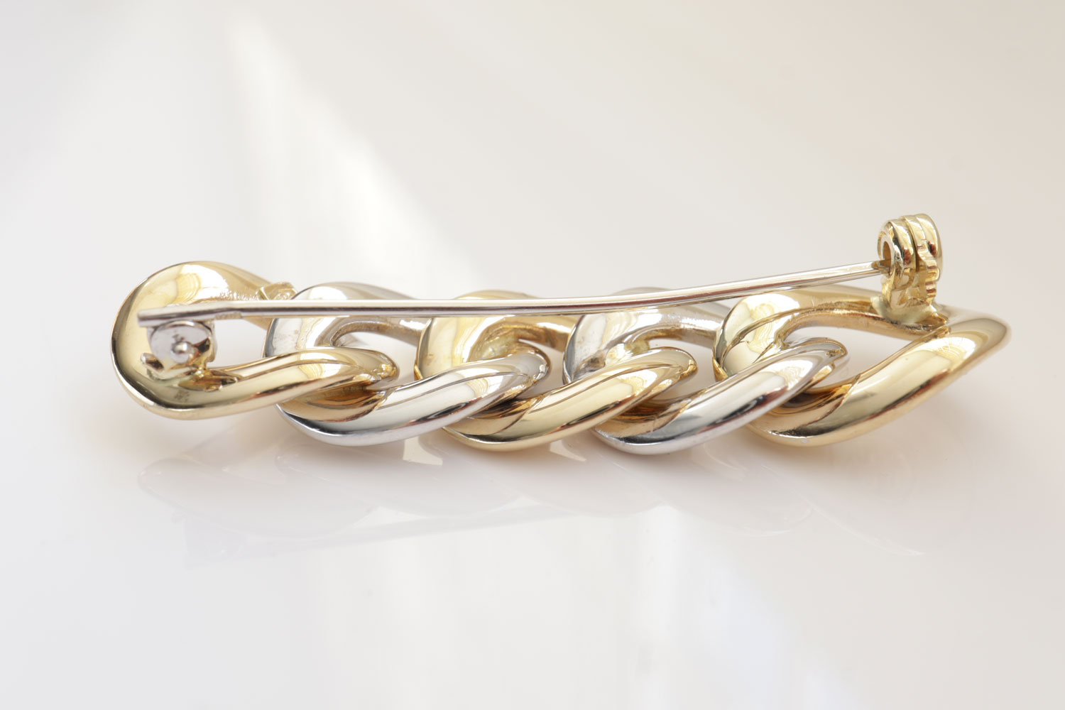 Z310-3120Met deze sierspeld kun je, je kleding versieren op een wel heel stijlvolle manier! De grove schakels zorgen dat de broche een wat stoerder en meer tijdloos imago krijgt maar tevens elegant over komt. Doordat deze broche is gemaakt van 2 kleuren goud, maakt het dit tot een item die je met al je bestaande sieraden kunt combineren.