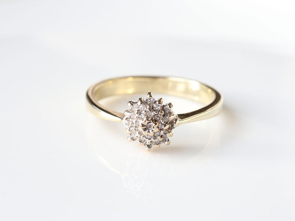 Deze 14 karaat gouden cluster ring is gezet met 25 diamanten. Veel schittering en een elegante, tijdloze uitstraling.