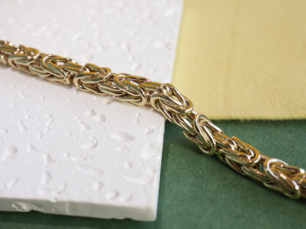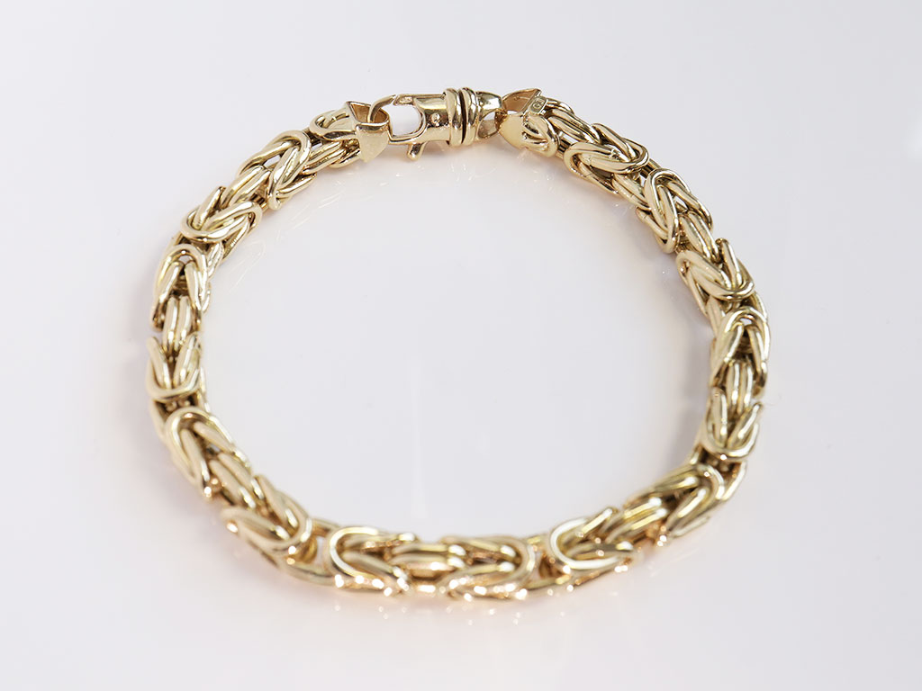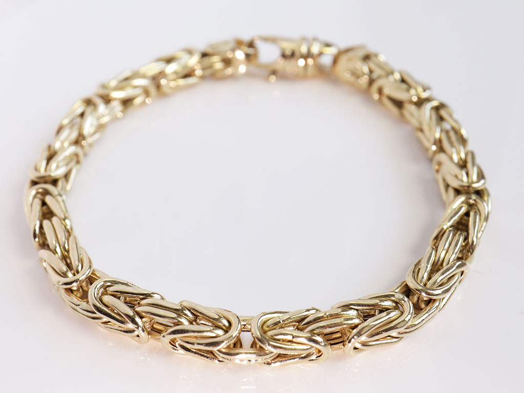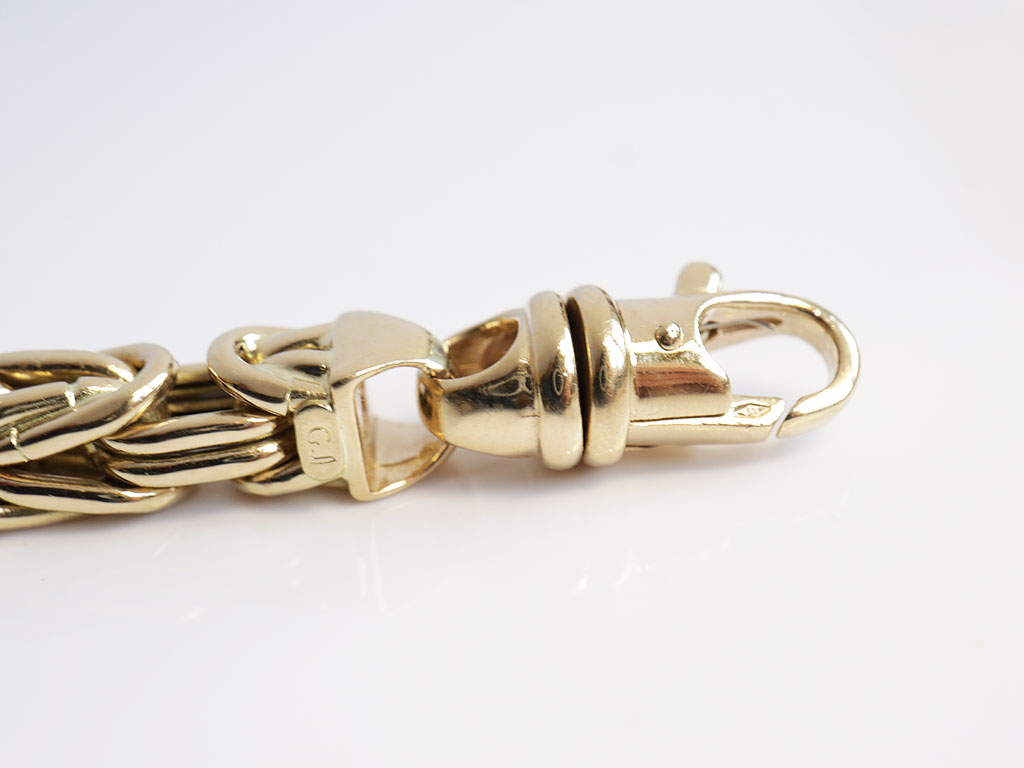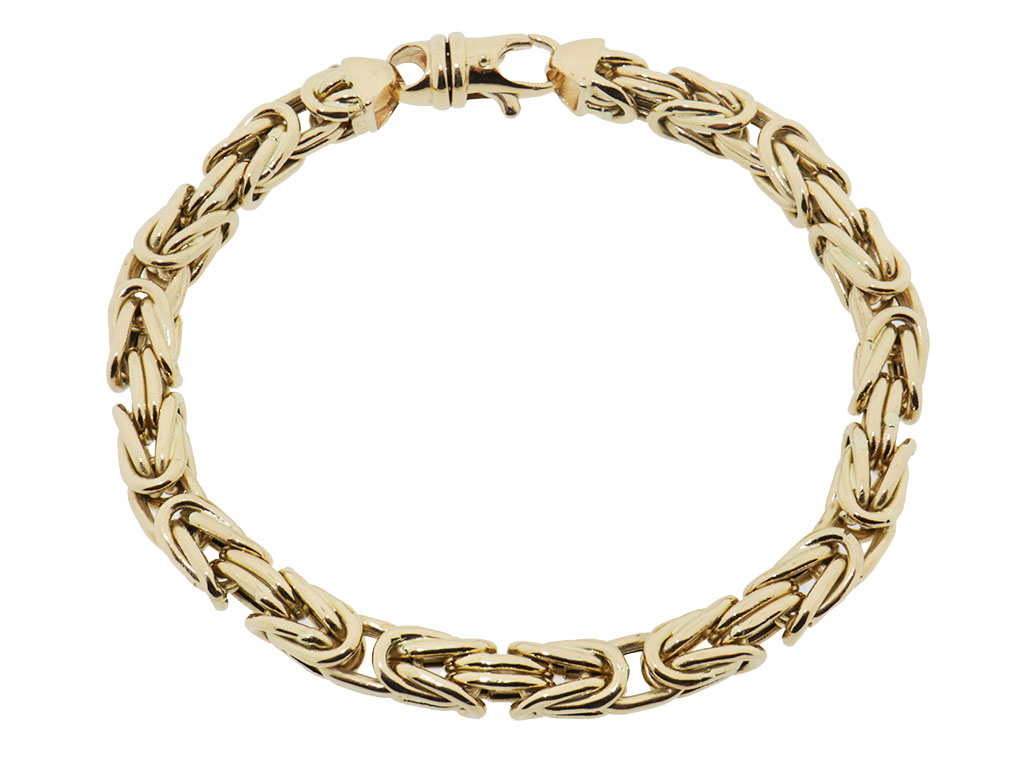 Stoer. Tijdloos. Statement piece. Een 14 karaat gouden herenarmband met koningschakel van 7 mm breed. Tijdloos, krachtig en uitgevoerd met een stevige karabijn haaksluiting.