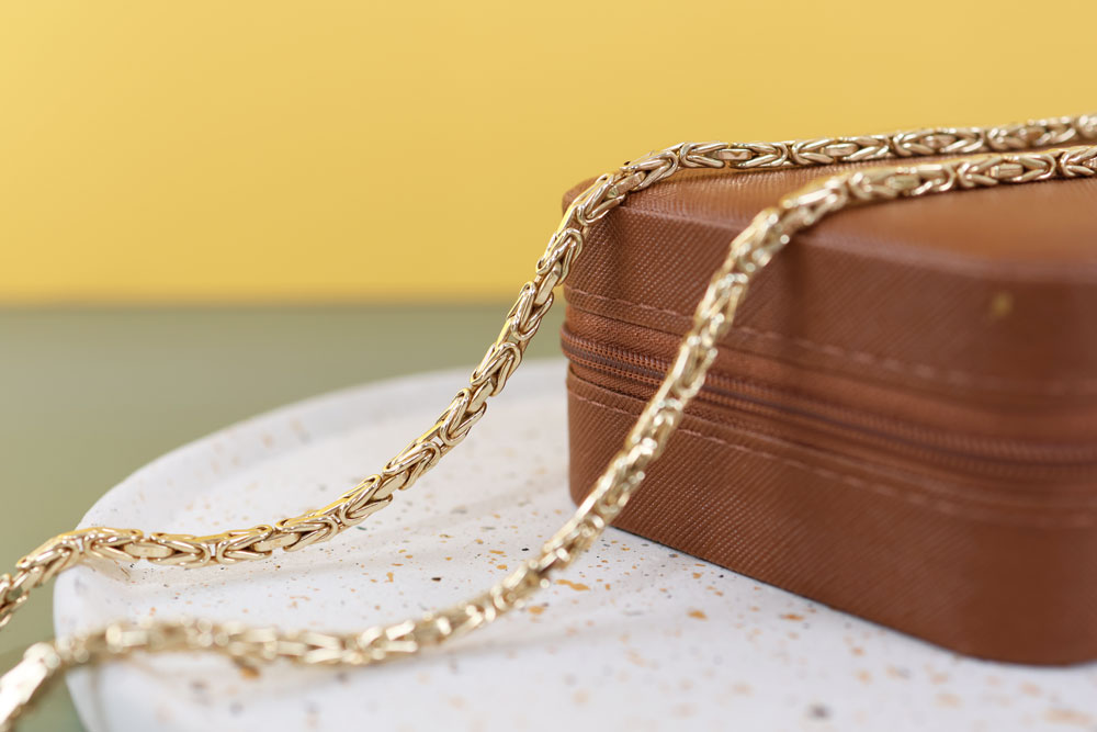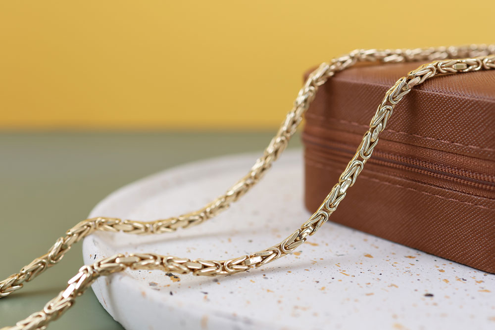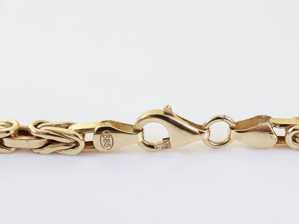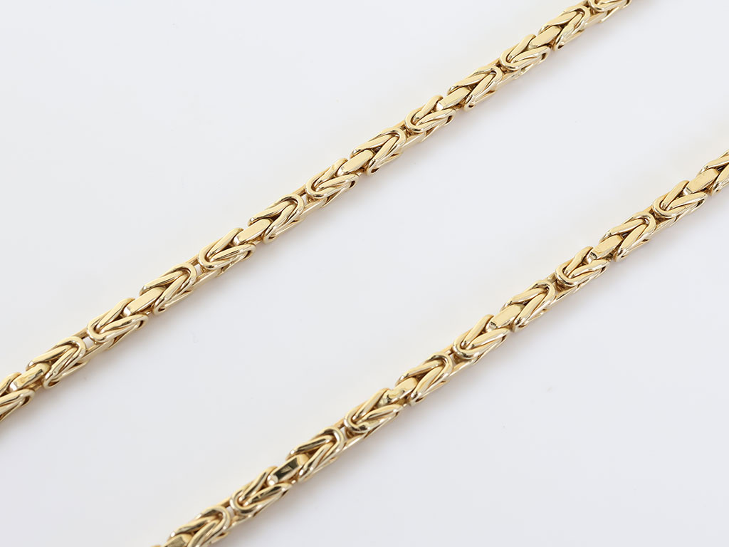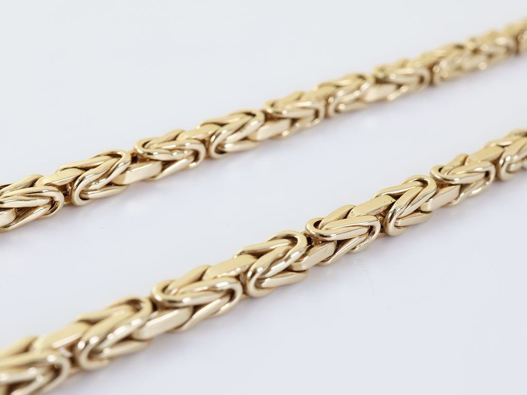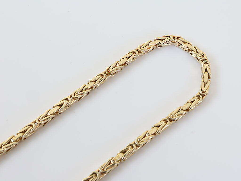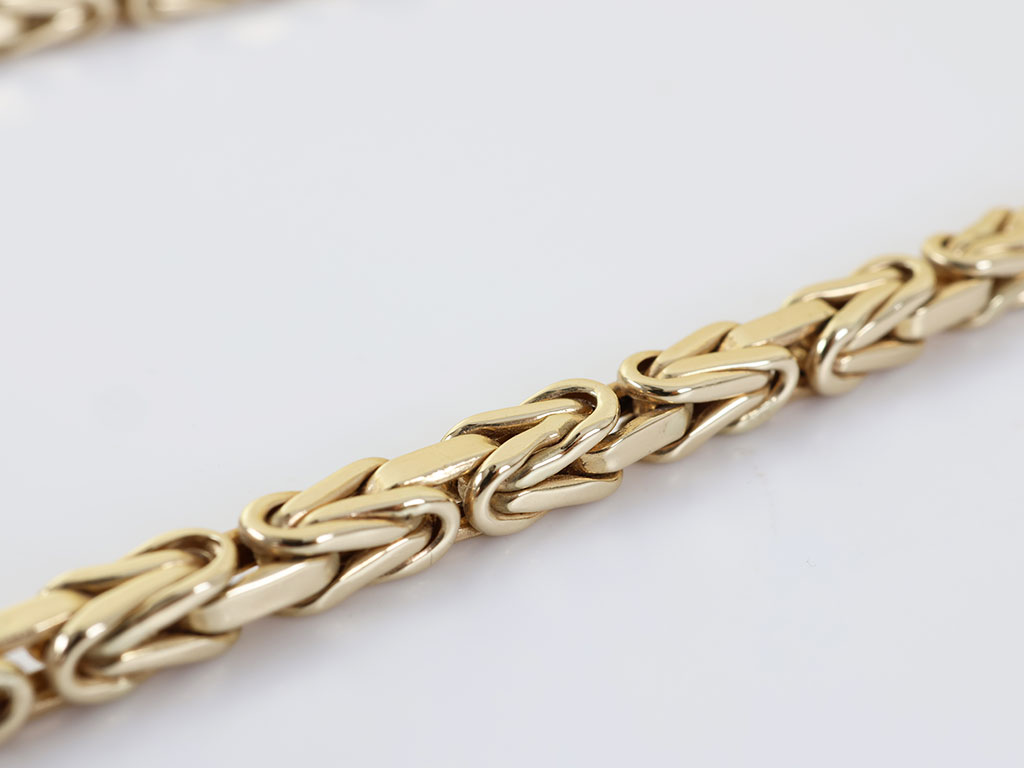 Deze massief gouden heren ketting is gemaakt van 18 karaat geelgoud. Het collier heeft een zeer verfijnde byzantijnse koningsschakel van 4 mm breed. De ketting sluit door middel van een stevige karabijn haaksluiting.