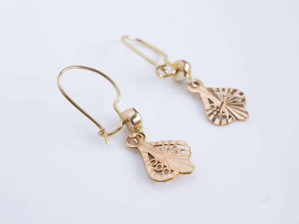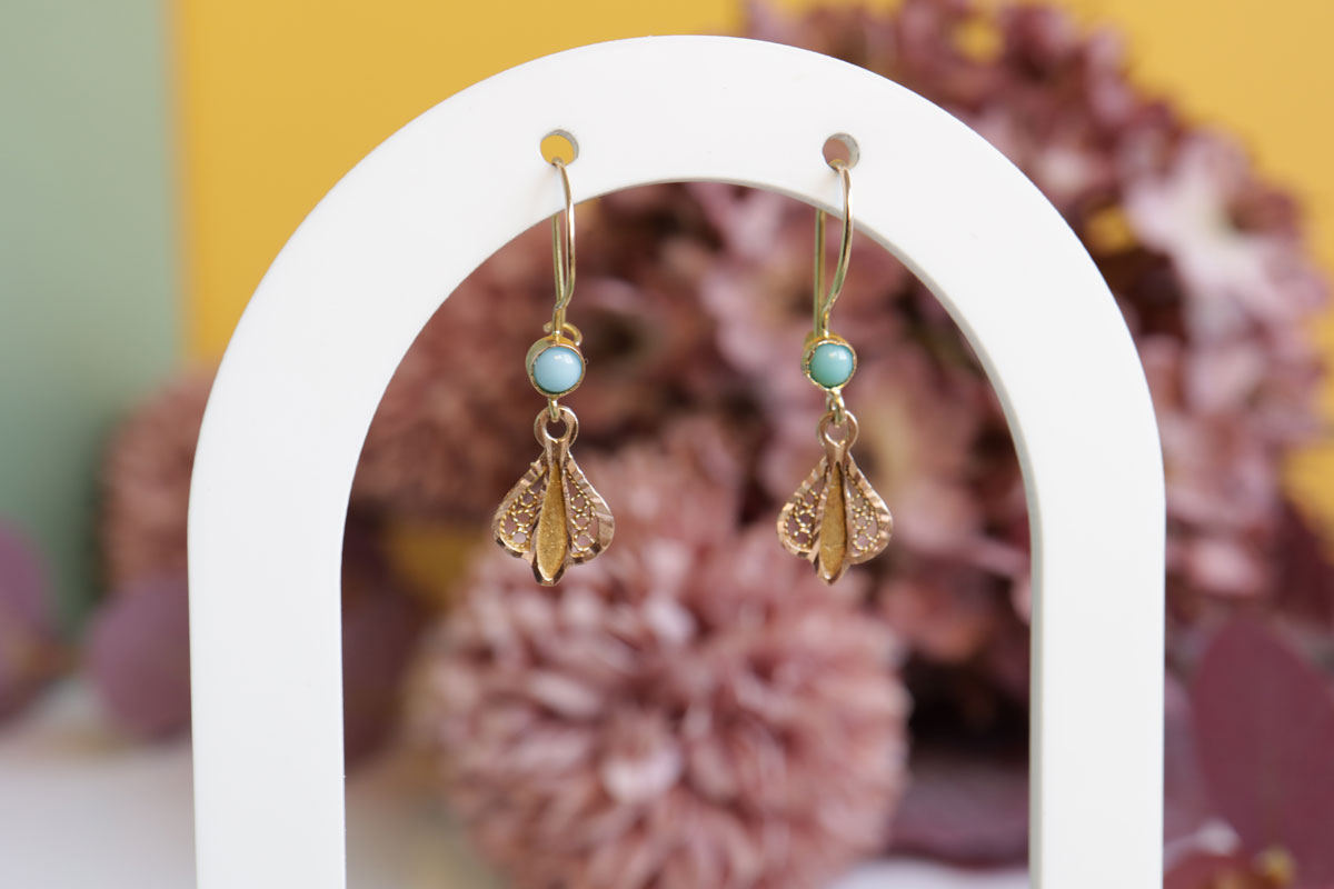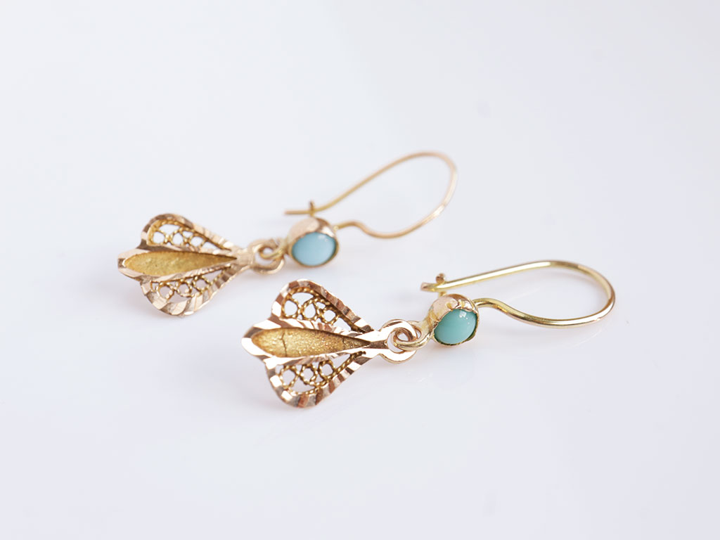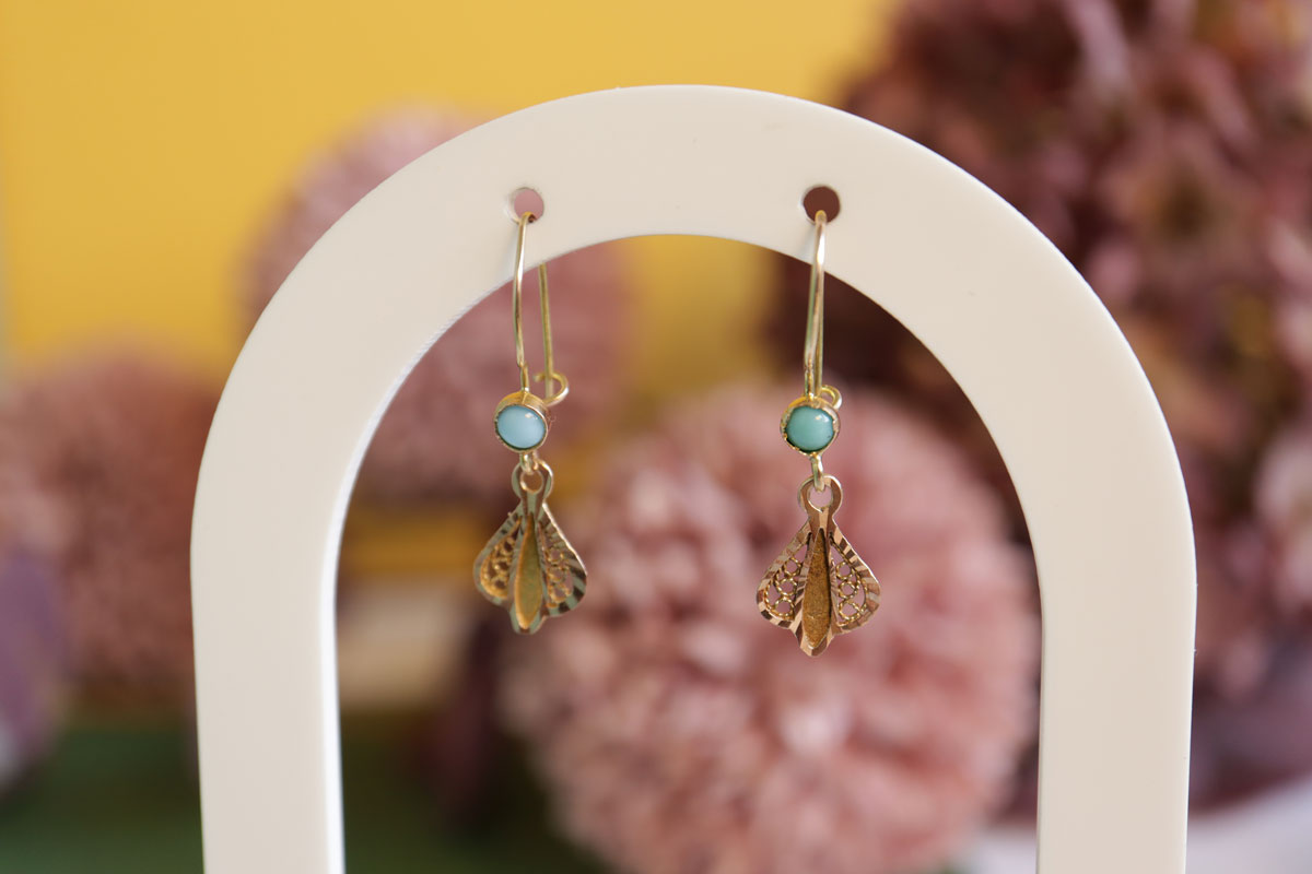 Z316-3176Deze schattige oorbellen zijn gemaakt van 14 karaat goud. De hanger zijn subtiel vormgegeven doordat bewegende deel bewerkt is. Deze bewerking met de filigrain techniek, geeft dat deel van het goud een zachte uitstraling. Aan het vaste deel van deze oorbellen is een turkoois edelsteen te zien. Eentje die altijd zorgt voor een frisse uitstraling.