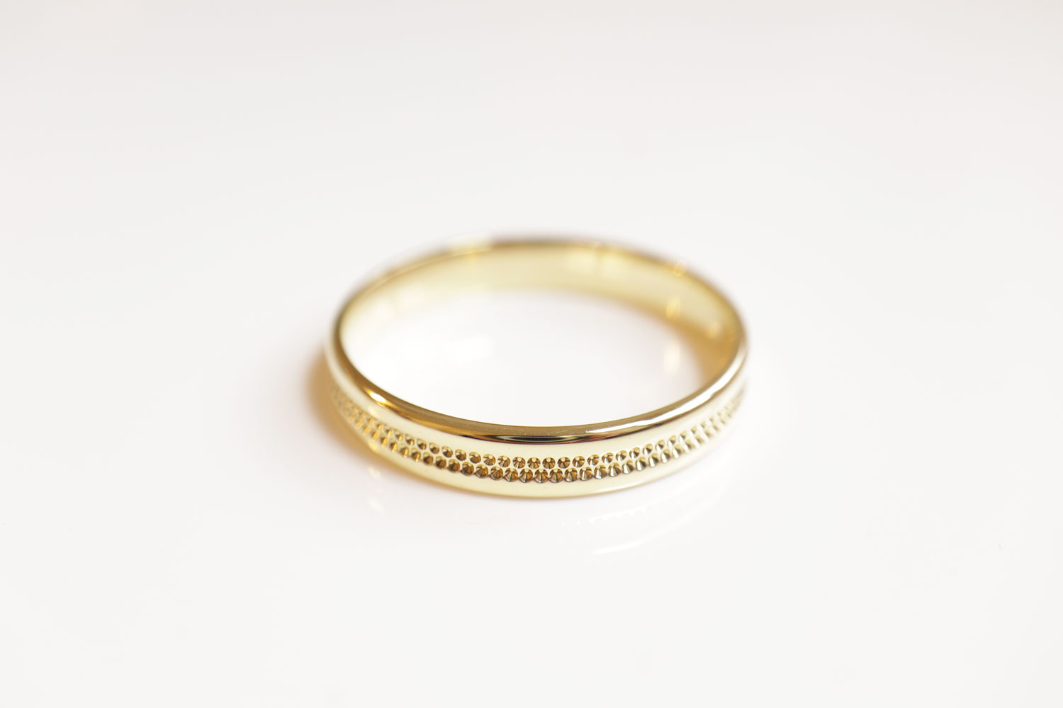 Z321-3230Deze 14 karaat gouden ring straalt pure elegantie uit door zijn perfecte balans tussen eenvoud en detail. De ring heeft een prachtige warme glans en is rondom voorzien van een subtiele puntjesbewerking, die zorgt voor een verfijnd reliëf en een levendig spel van licht.
