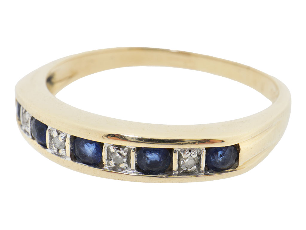 Z327-3284Deze klassieke 14 karaat gouden ring is een prachtig voorbeeld van tijdloze elegantie. In de band zijn diepblauwe saffieren en sprankelende diamanten afwisselend geplaatst, wat zorgt voor een verfijnd kleurcontrast en een luxe uitstraling. Met een gewicht van 3,07 gram voelt de ring comfortabel aan en is hij geschikt voor dagelijks dragen.