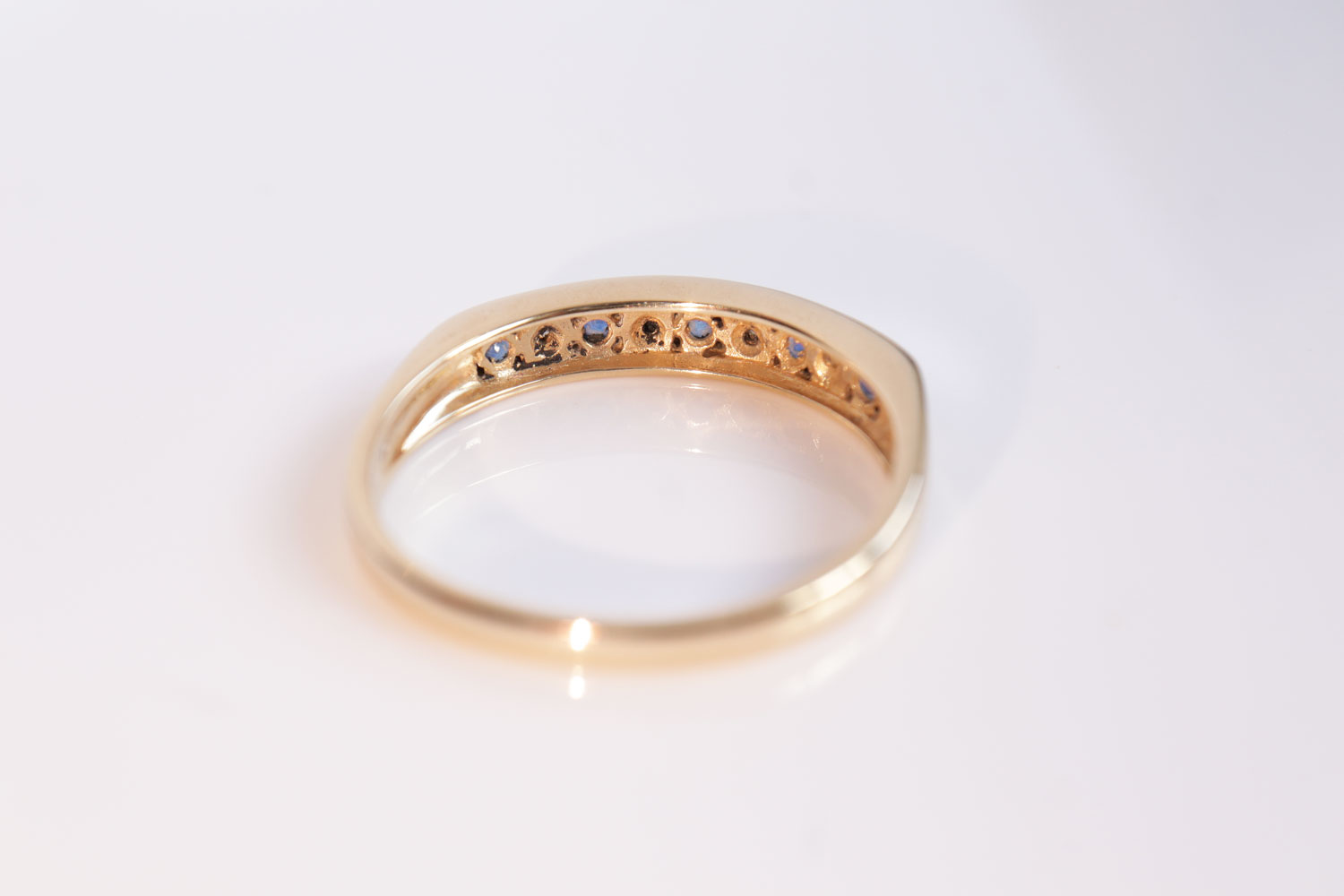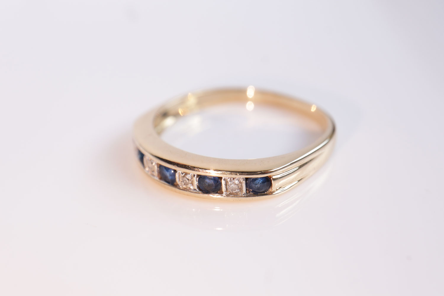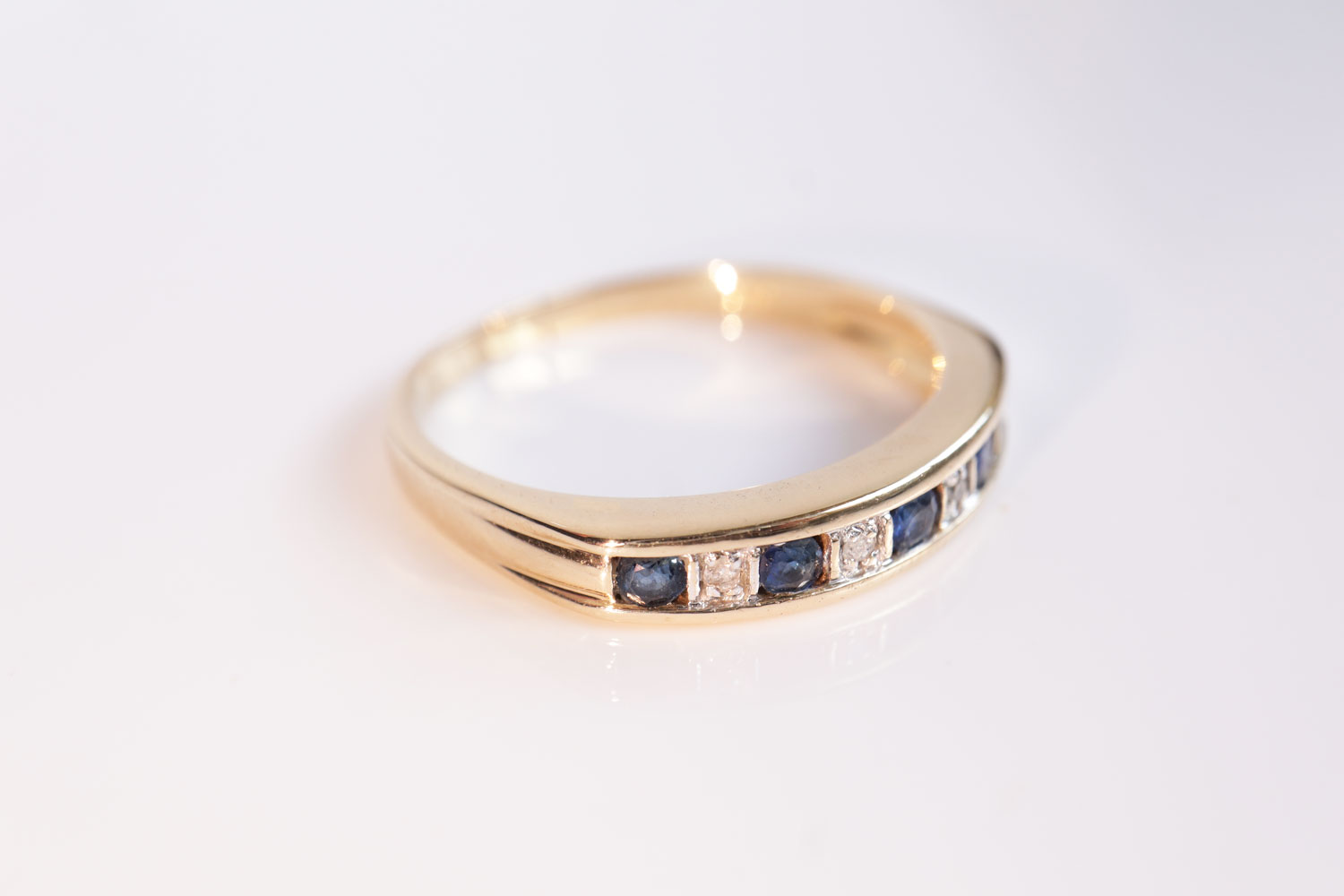 De stenen zijn gezet in een subtiele rijzetting, waardoor ze mooi in het goud verzonken liggen. Dit zorgt niet alleen voor een strak en elegant uiterlijk, maar maakt de ring ook praktisch en duurzaam in gebruik. De combinatie van saffier en diamant geeft de ring een klassieke, bijna koninklijke uitstraling die nooit uit de mode raakt.