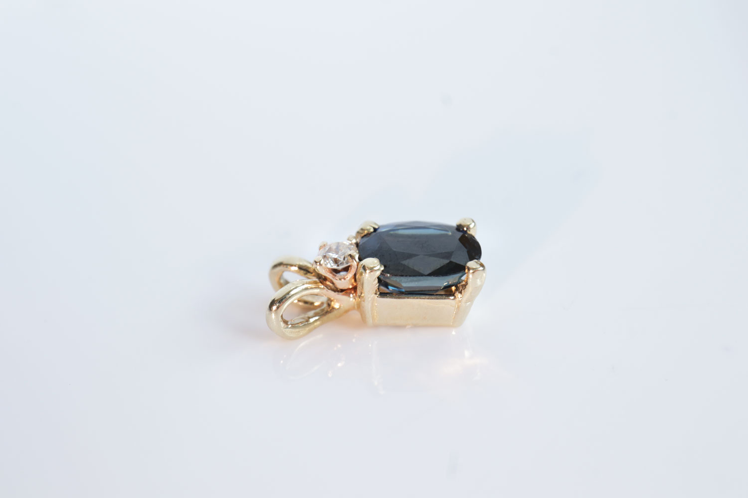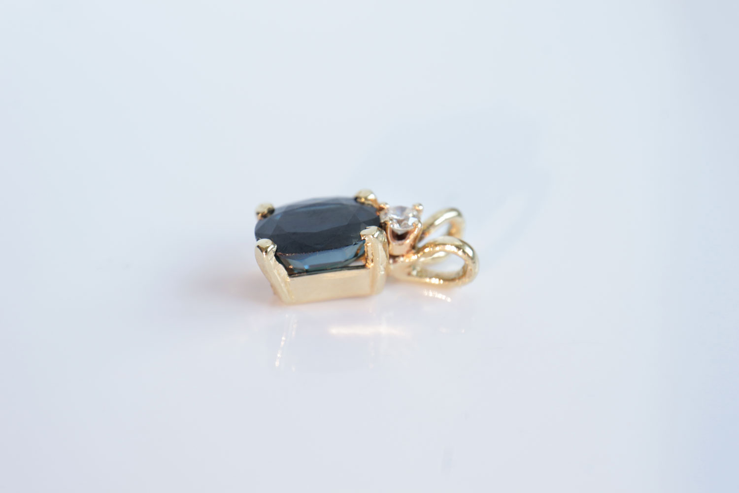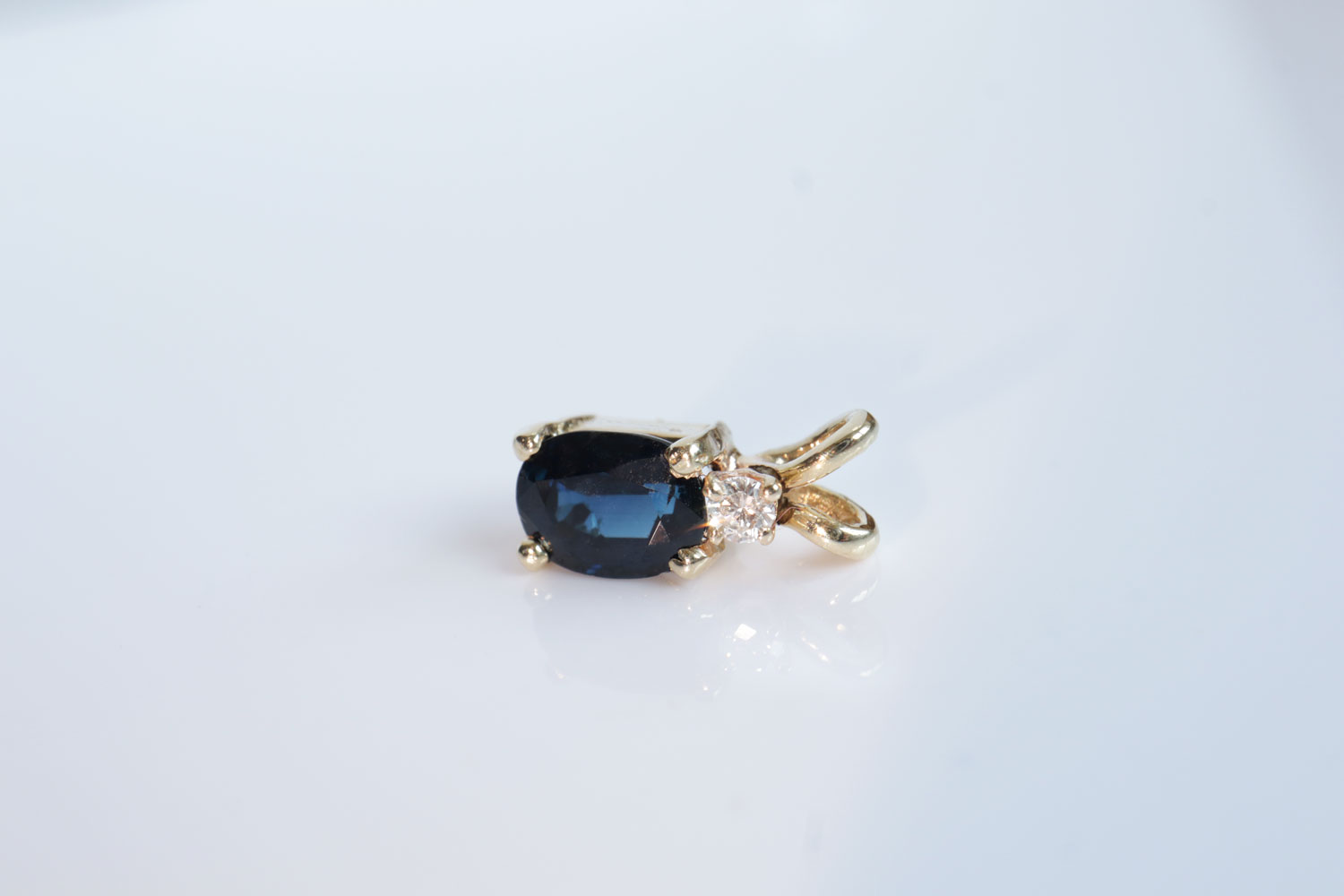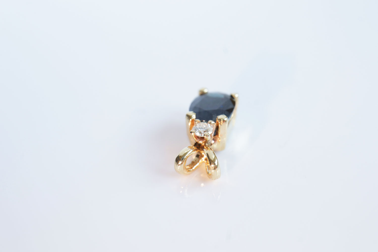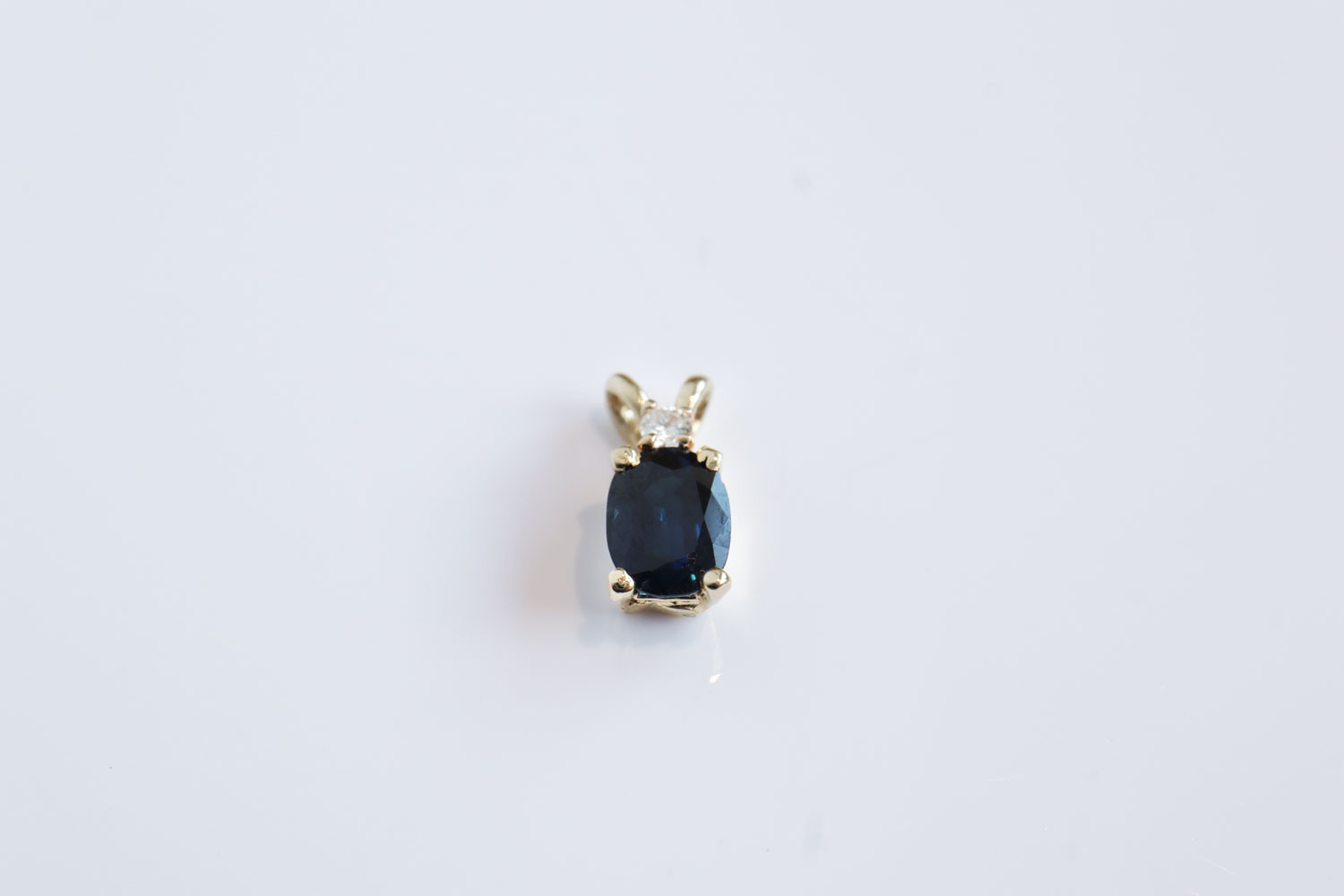 Tijdloze elegantie in zijn puurste vorm. Een 14 karaat gouden hanger met diepblauwe saffier en een subtiele diamant van 0.02 ct. Verfijnd, tijdloos en perfect om elke dag te dragen.