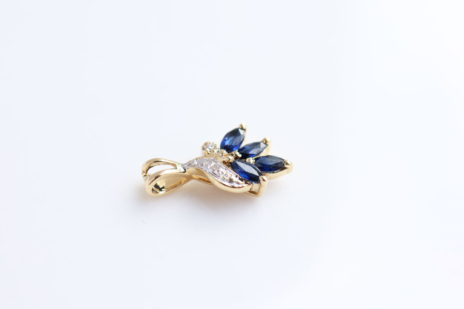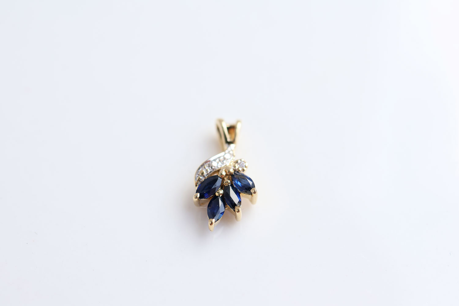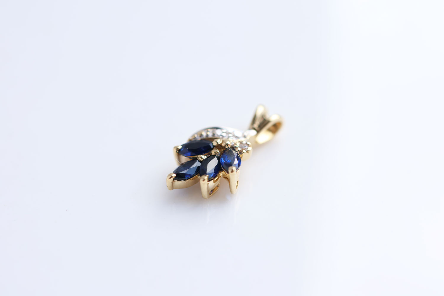 Een elegante 18 karaat gouden hanger bezet met saffieren en kleine diamanten. Het diepe blauw en de subtiele schittering zorgen voor een rijke, klassieke uitstraling.