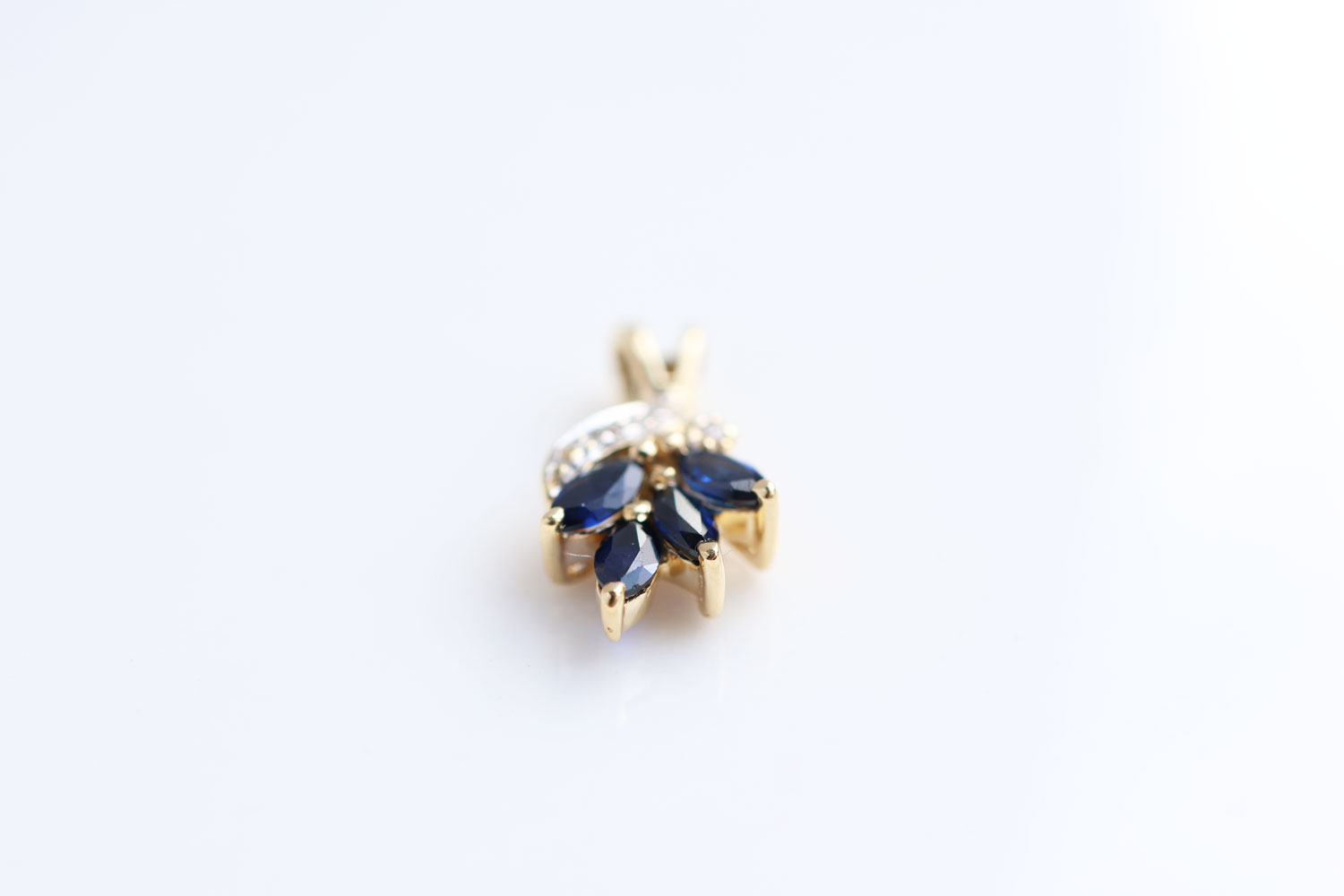 Deze 18 karaat gouden hanger is uitgevoerd met meerdere saffieren in marquise slijpvorm, gecombineerd met kleine diamanten in een sierlijke zetting. Samen vormen ze een prachtige bloem waarbij kleur en schittering elkaar versterken.