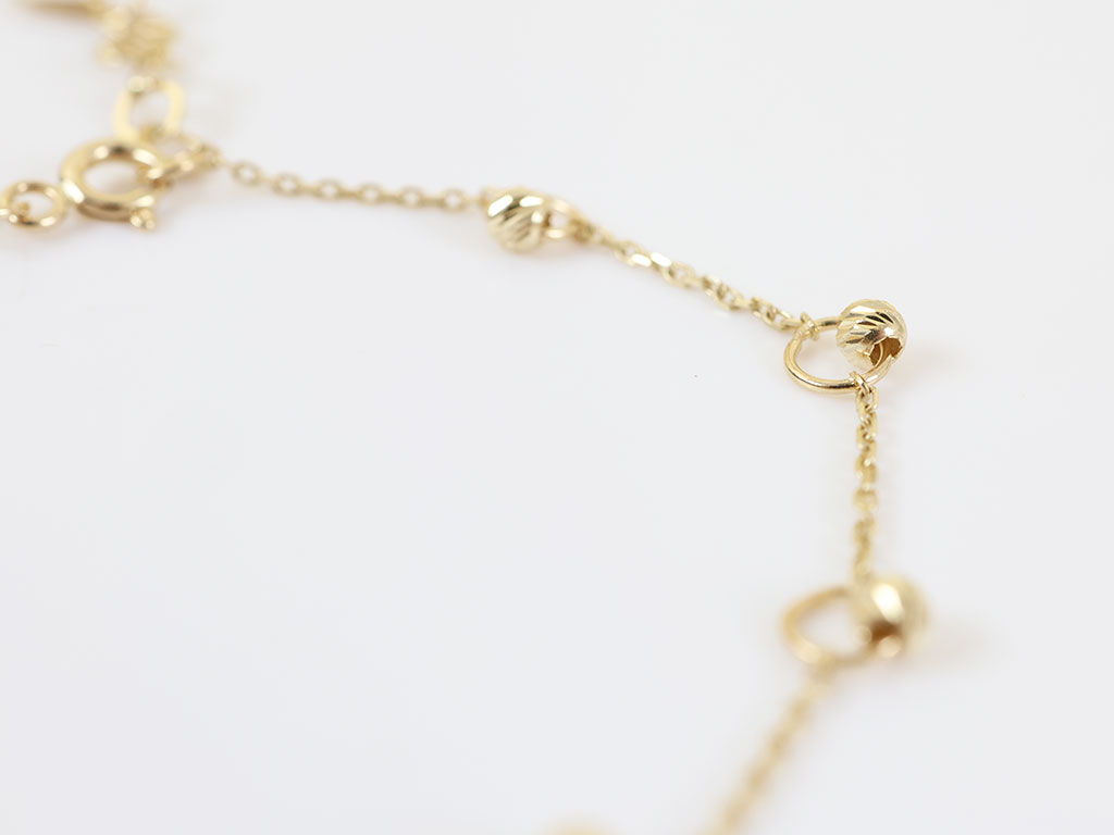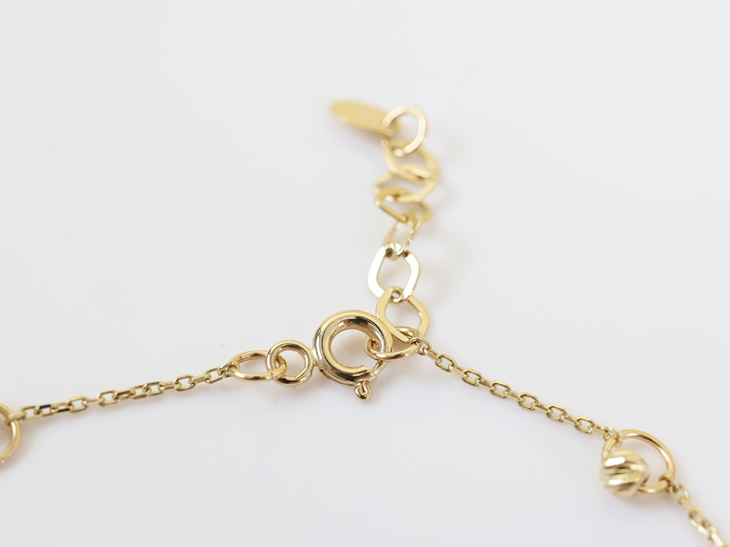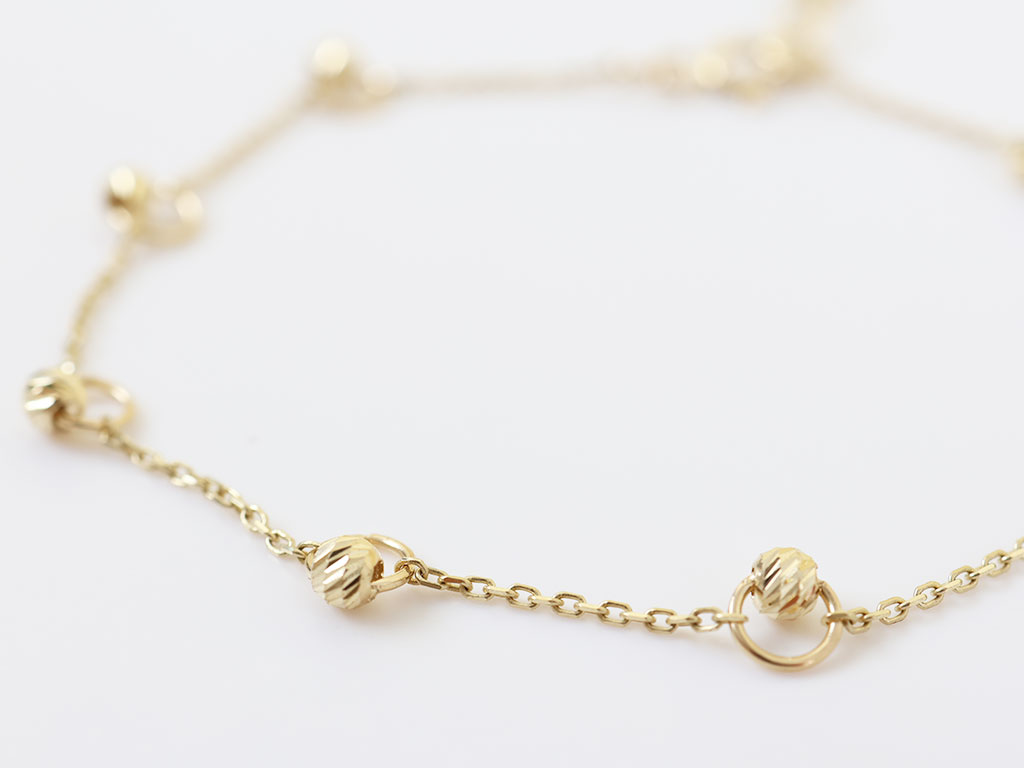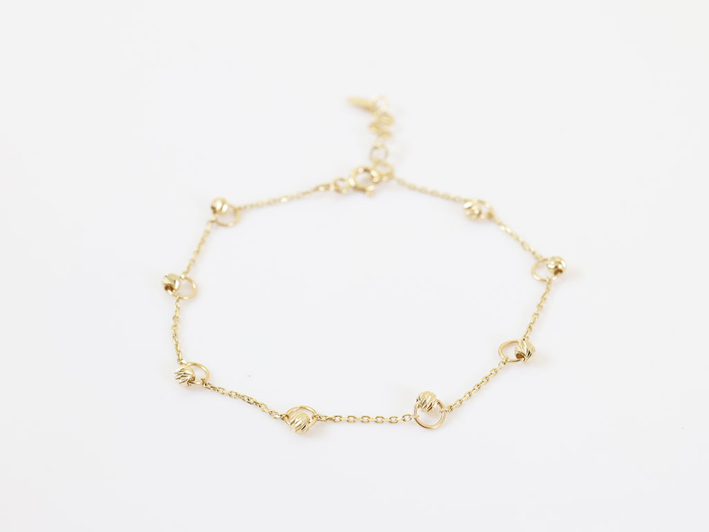 Z338-3398Deze 14 karaat gouden armband heeft een verfijnde en speelse uitstraling. Het ontwerp bestaat uit fijne schakels die worden afgewisseld met elegante open ringen en kleine facet geslepen gouden balletjes. Door deze combinatie ontstaat een subtiel glinsterend effect dat prachtig beweegt om de pols.
