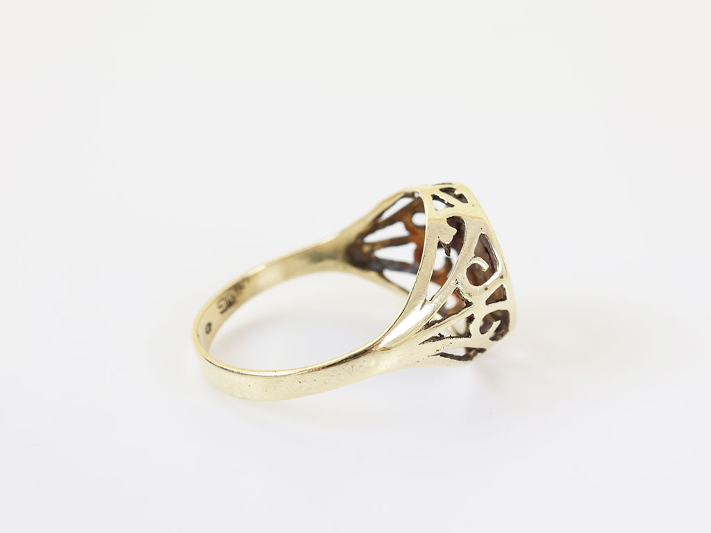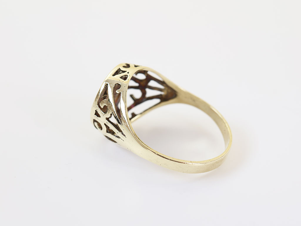 Deze gouden dames ring is een echte '' vintage musthave ''. De ring is gemaakt van 14 karaat geelgoud en gezet met een bloedkoraal. Hieromheen is een prachtige bewerking zichtbaar. Deze ring kan vermaakt worden.