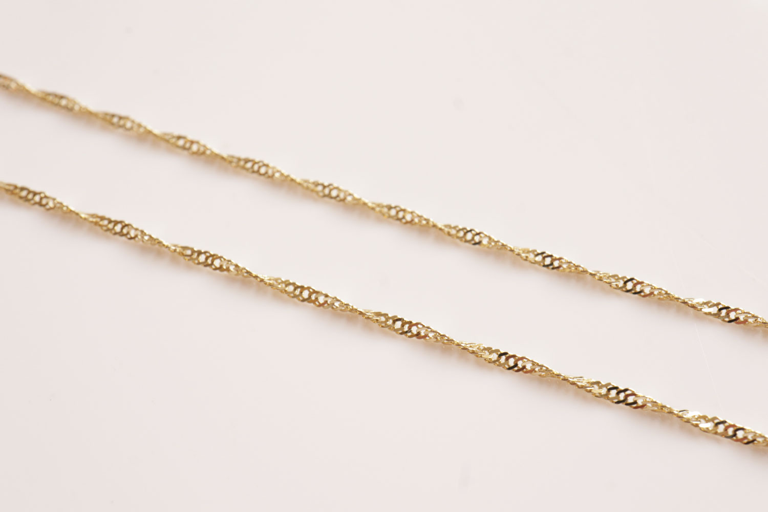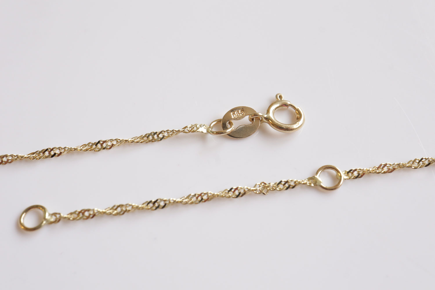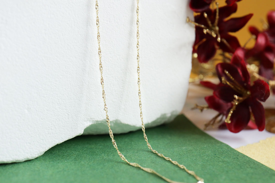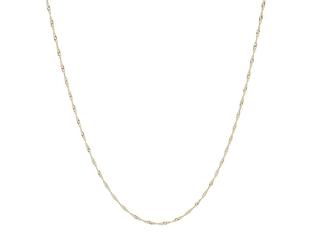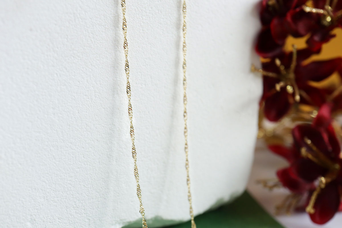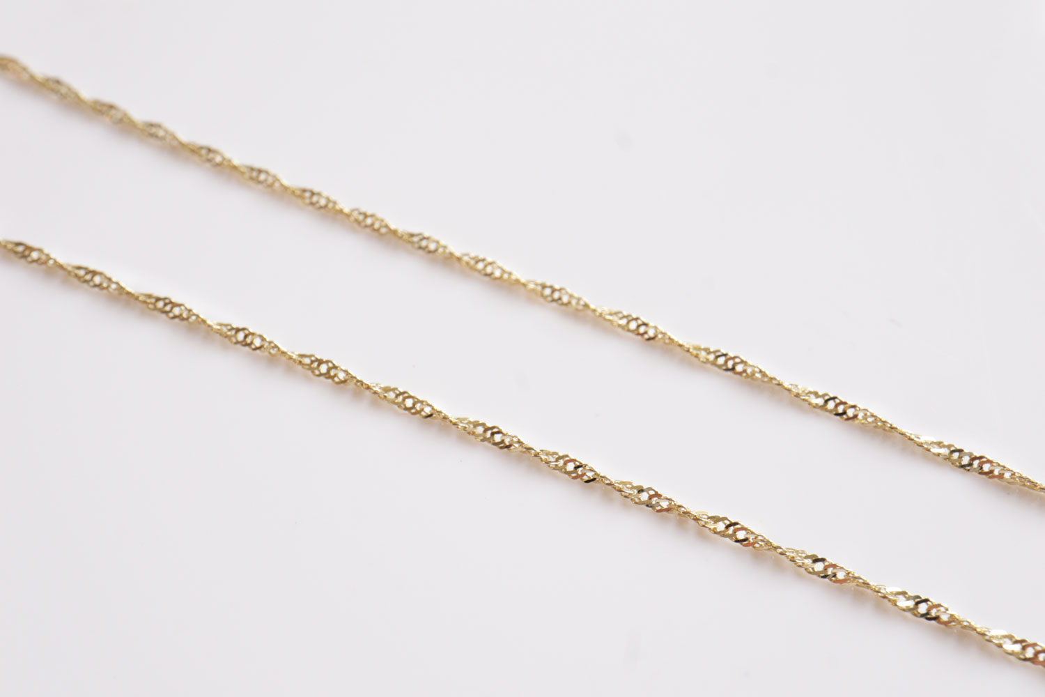 Z327-3282Dit verfijnde 14 karaat gouden collier met Singapore schakel is een tijdloos sieraad met een speelse, elegante uitstraling. De karakteristieke Singapore schakel staat bekend om zijn subtiele draaiing, waardoor het collier bij elke beweging prachtig licht vangt en een zachte schittering laat zien.