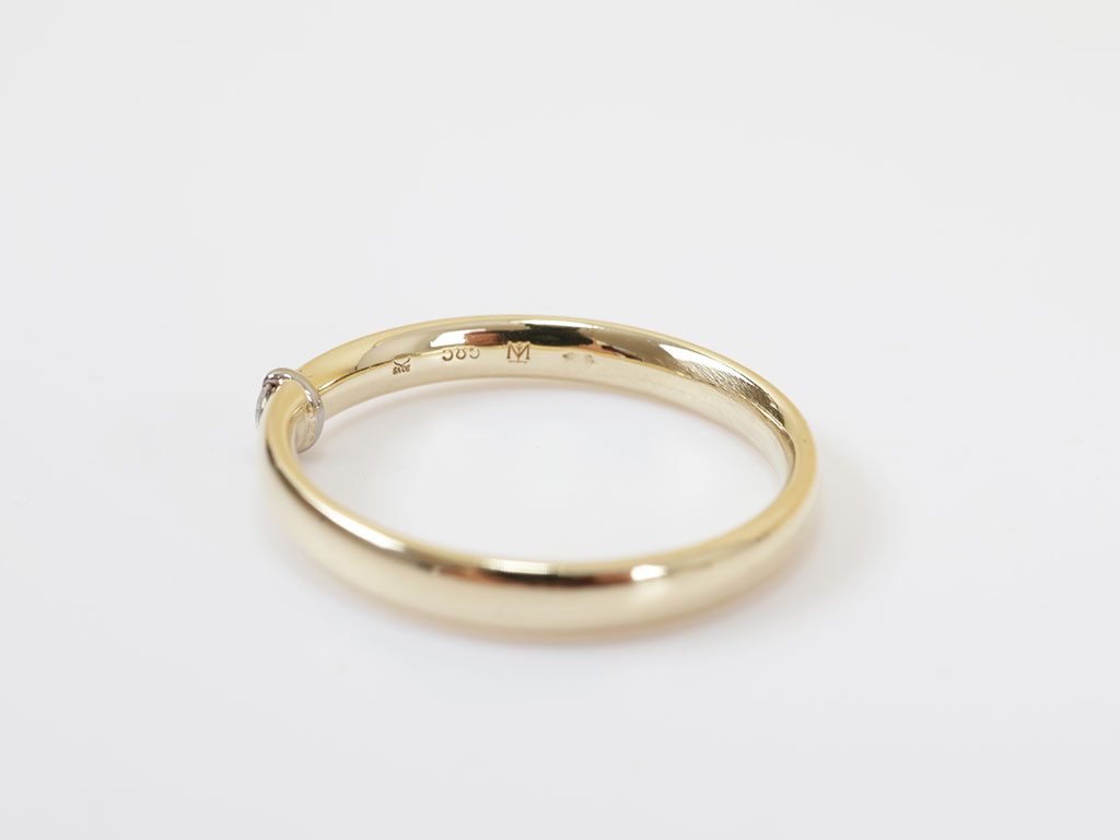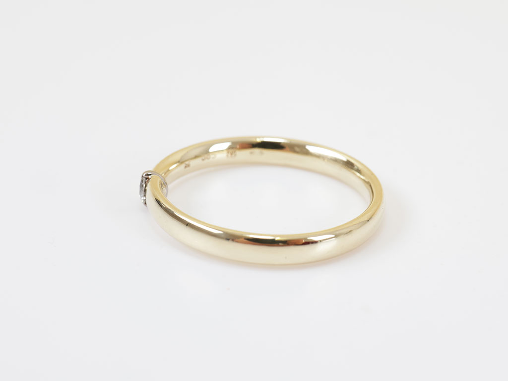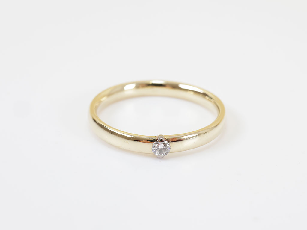 Deze 14 karaat gouden solitair ring is gezet met een briljant geslepen diamant. Het ontwerp is minimalistisch en daarom heel erg geschikt als verlovingsring of als aanschuifring. De diamant heeft een gewicht van 0.05 ct.