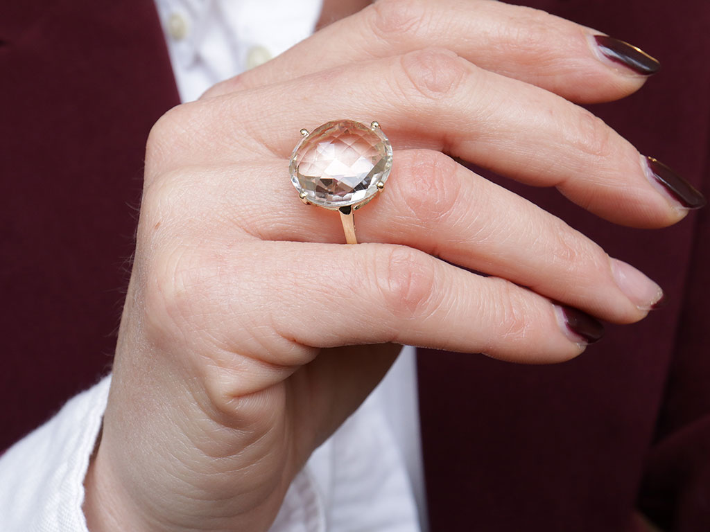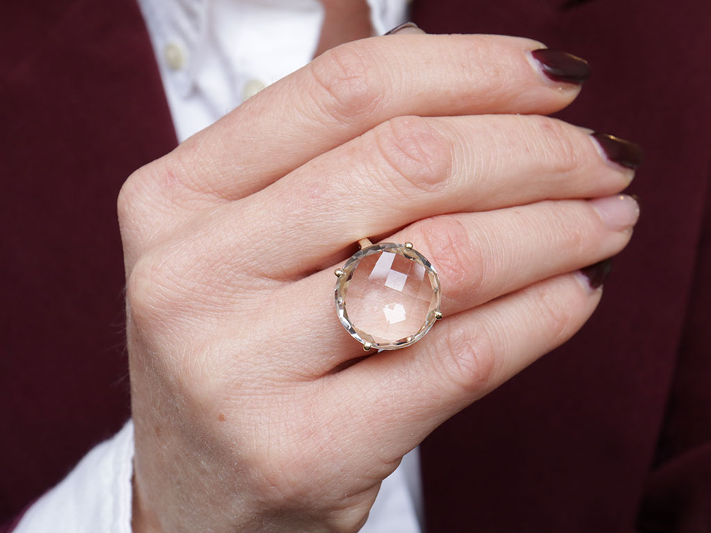 De ring is handgemaakt van 14 karaat goud en heeft een elegante, minimalistische zetting waardoor de steen volledig tot zijn recht komt. De gefacetteerde slijpvorm zorgt voor een schitterend spel van licht bij elke beweging van je hand.