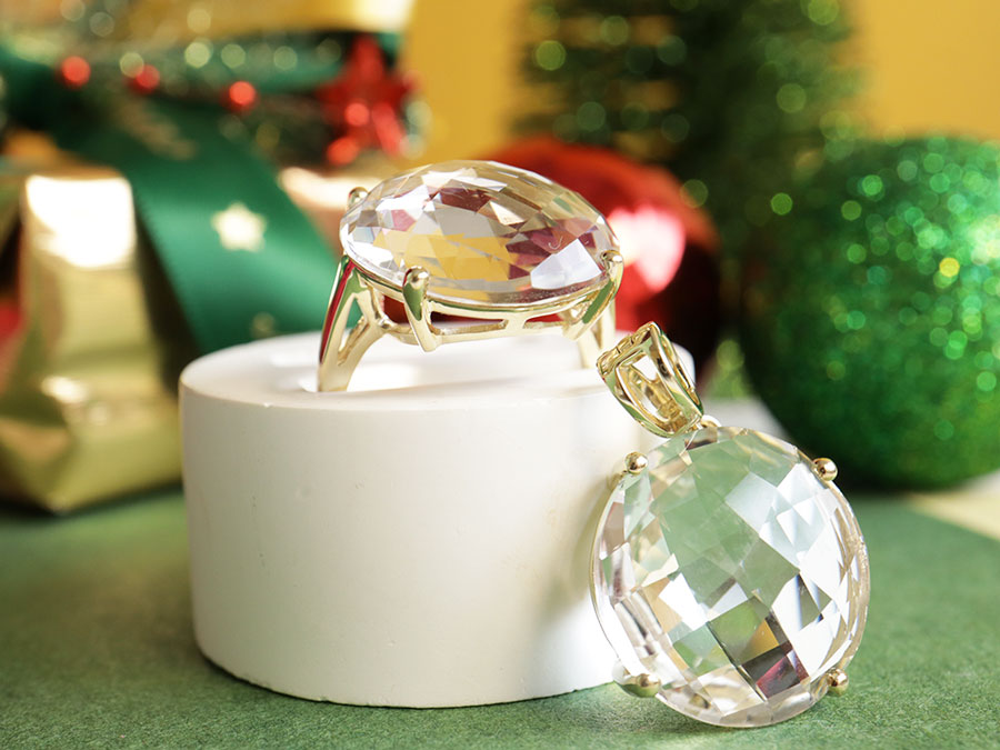 Deze 14 karaat gouden ring draagt een indrukwekkende 18 mm bergkristal – een echte eyecatcher die licht vangt bij elke beweging. Elegant, modern en perfect te combineren met de bijpassende hanger.
