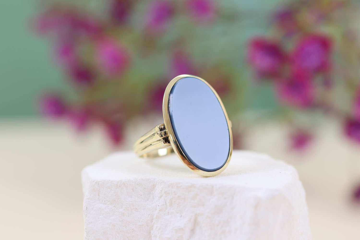 Waanzinnig! Dit is een ring 14 karaat gouden zegelring die opvalt, klassiek en super stijlvol is. Het is de blauwe steen die perfect combineert met het goud.