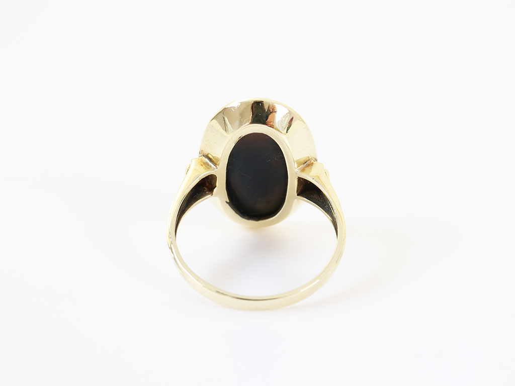 Deze vintage gouden ring is een echte statement ring. Hij is gemaakt van 14 karaat goud, met in het middelpunt een prachtige grote edelsteen die alle aandacht trekt. De sierlijk bewerkte zetting omarmt de edelsteen met verfijning en voegt een vintage charme toe aan het geheel.