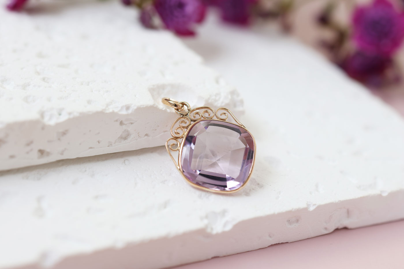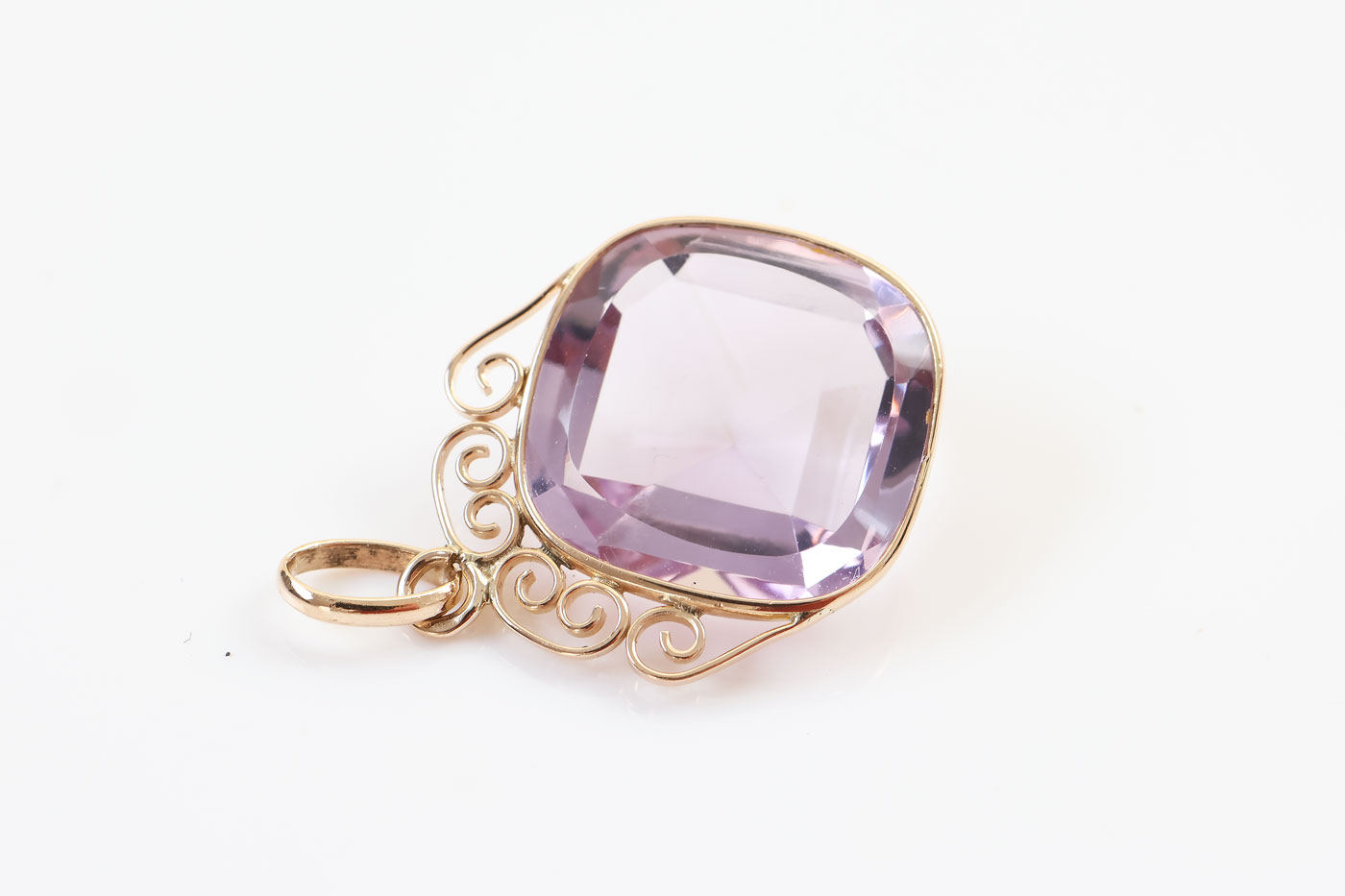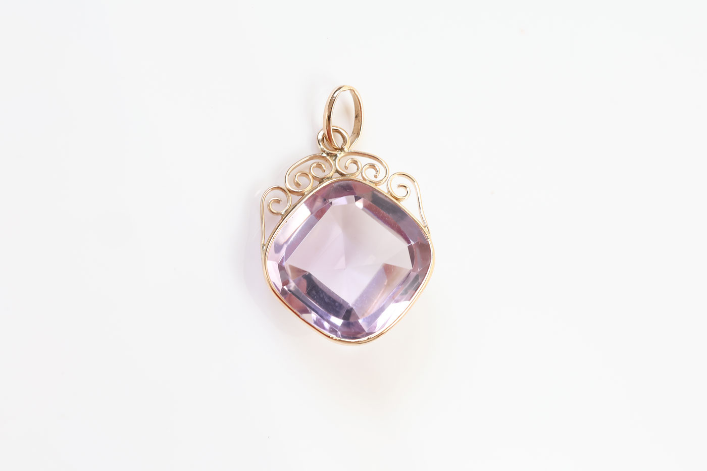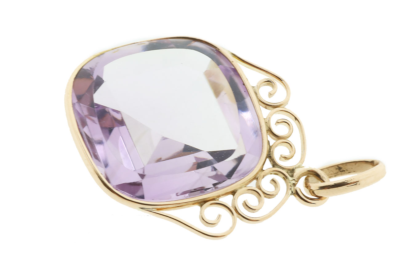 Z336-3374Deze 14 karaat vintage gouden hanger met amethist is een echte blikvanger. In het midden zit een grote lichtpaarse steen in een zachte kussenvormige slijpvorm, die het licht mooi vangt.