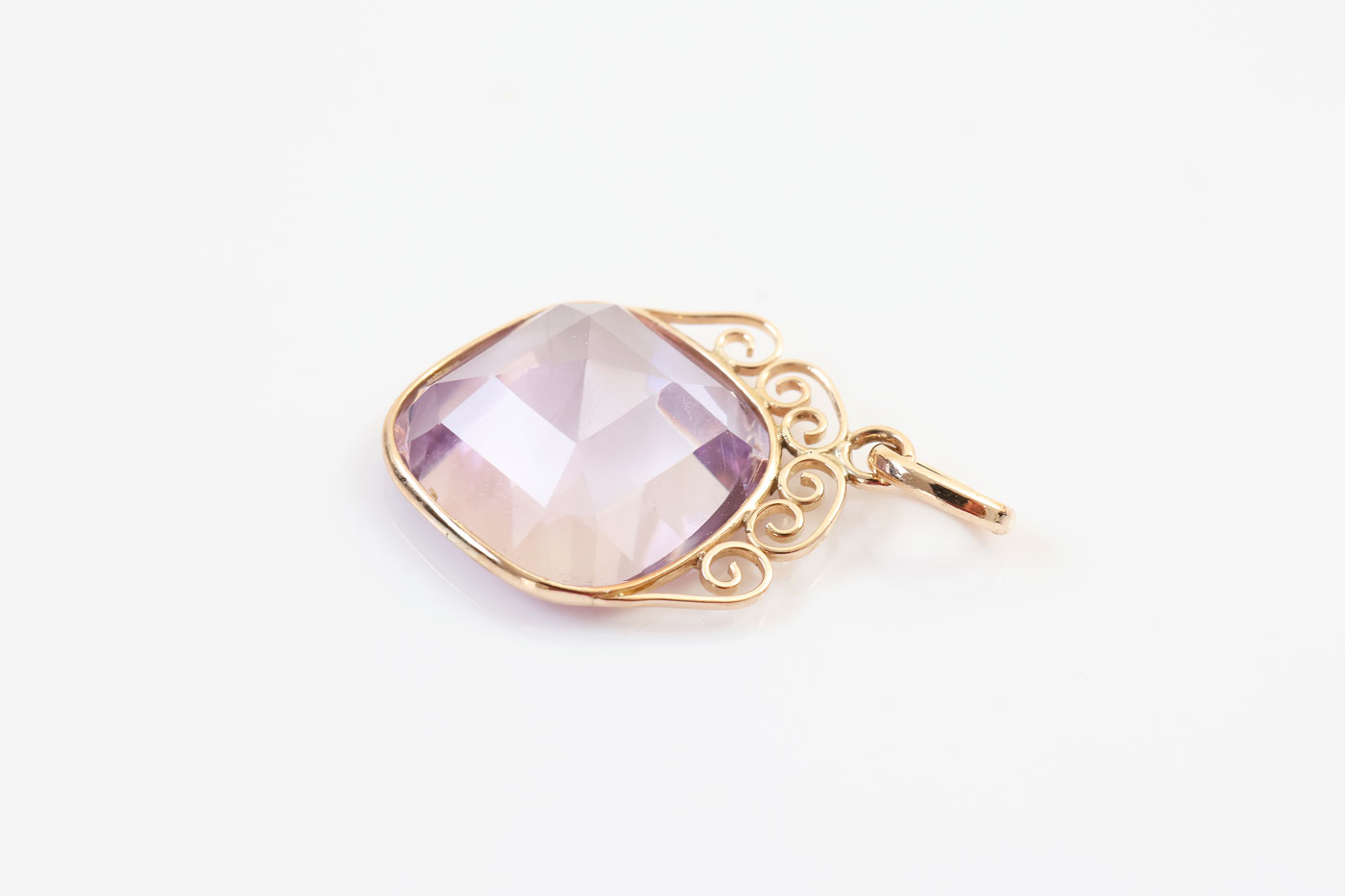 De hanger wordt extra bijzonder door het opengewerkte goudwerk rondom de steen. De sierlijke krullen geven het ontwerp een klassieke en vrouwelijke uitstraling, typisch voor vintage sieraden.