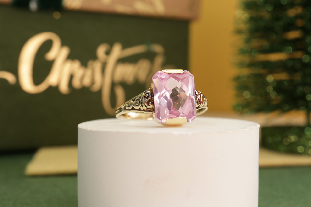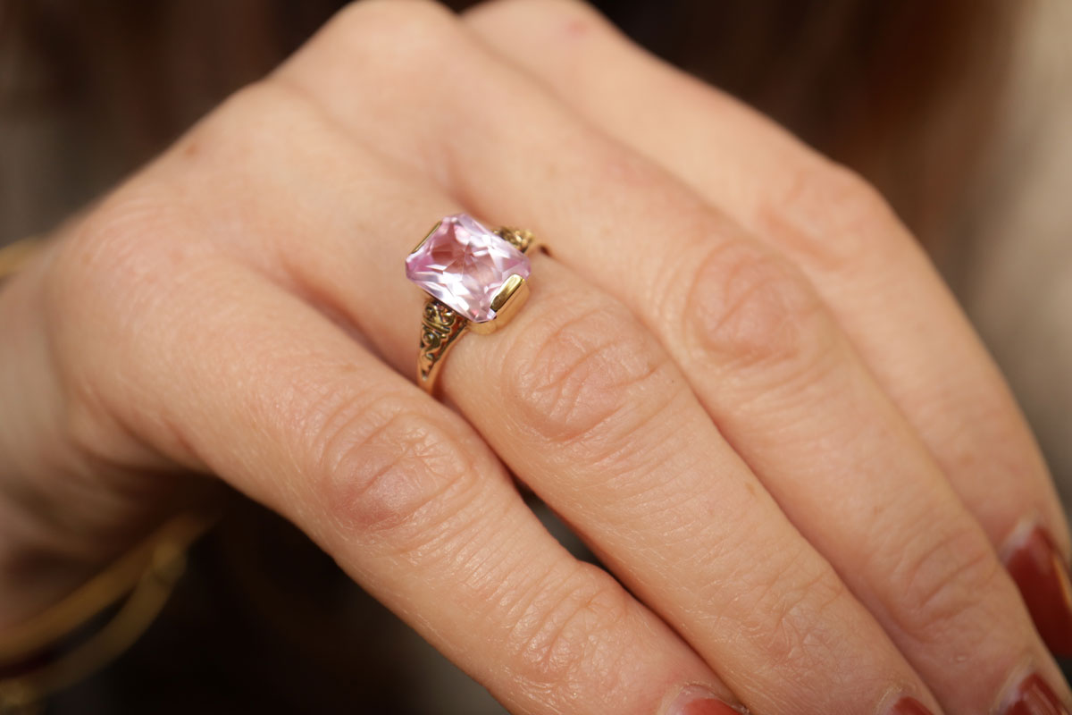 Z320-3214Een roze toermalijn edelsteen, 14 karaat goud en een vintage ontwerp zijn de perfecte combinatie. De toermalijn staat centraal en is facet geslepen, hierdoor straalt hij aan alle kanten. De licht roze kleur geeft de ring een zachte en romantische uitstraling.