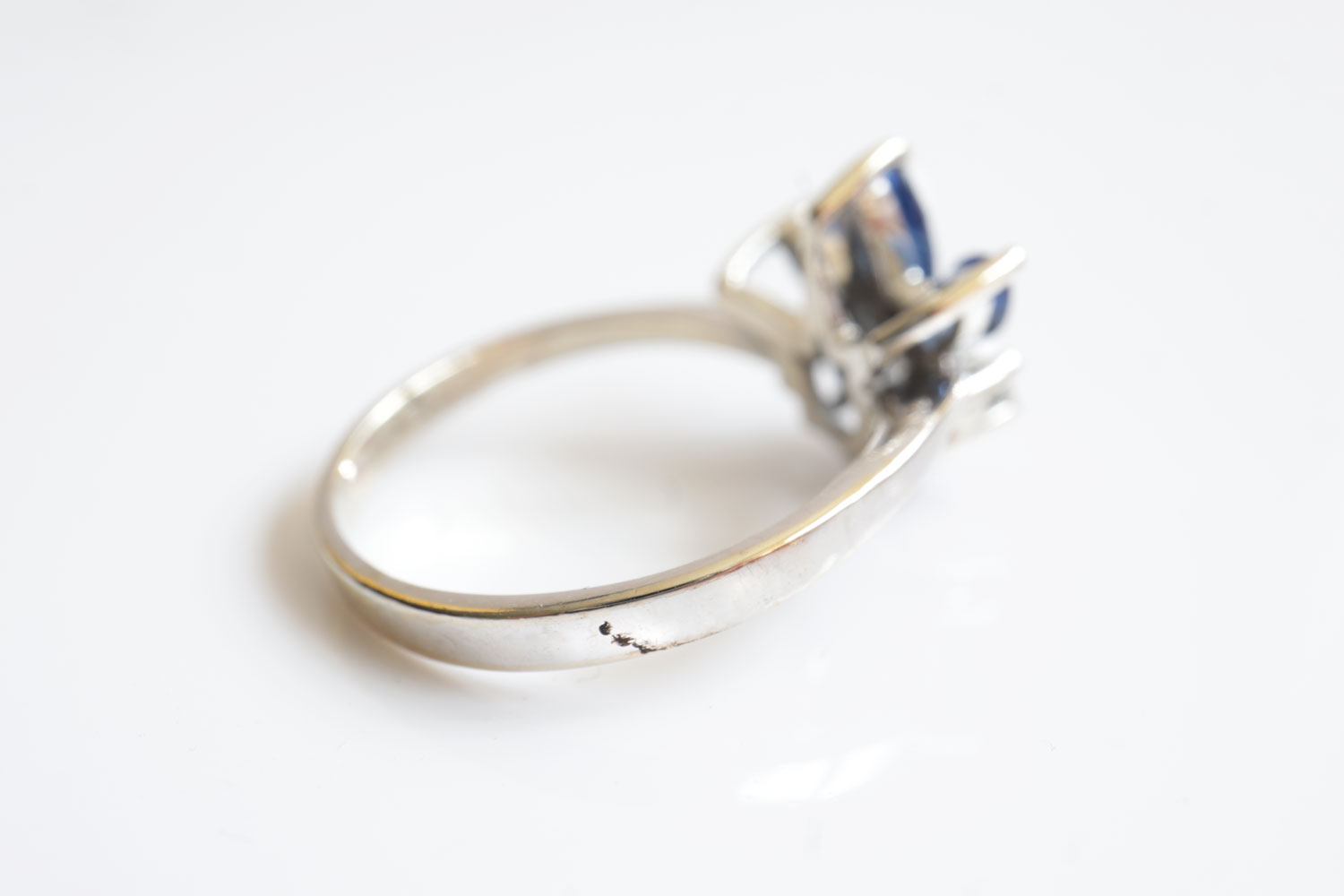 Z301-3027Deze bloemvormige ring straalt van sierlijkheid en vrouwelijkheid. Maar ook door de 0.06 karaat diamanten en de diepblauwe Saffier, die voor wijsheid en trouw staat.
