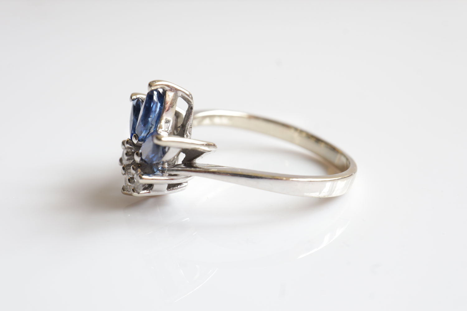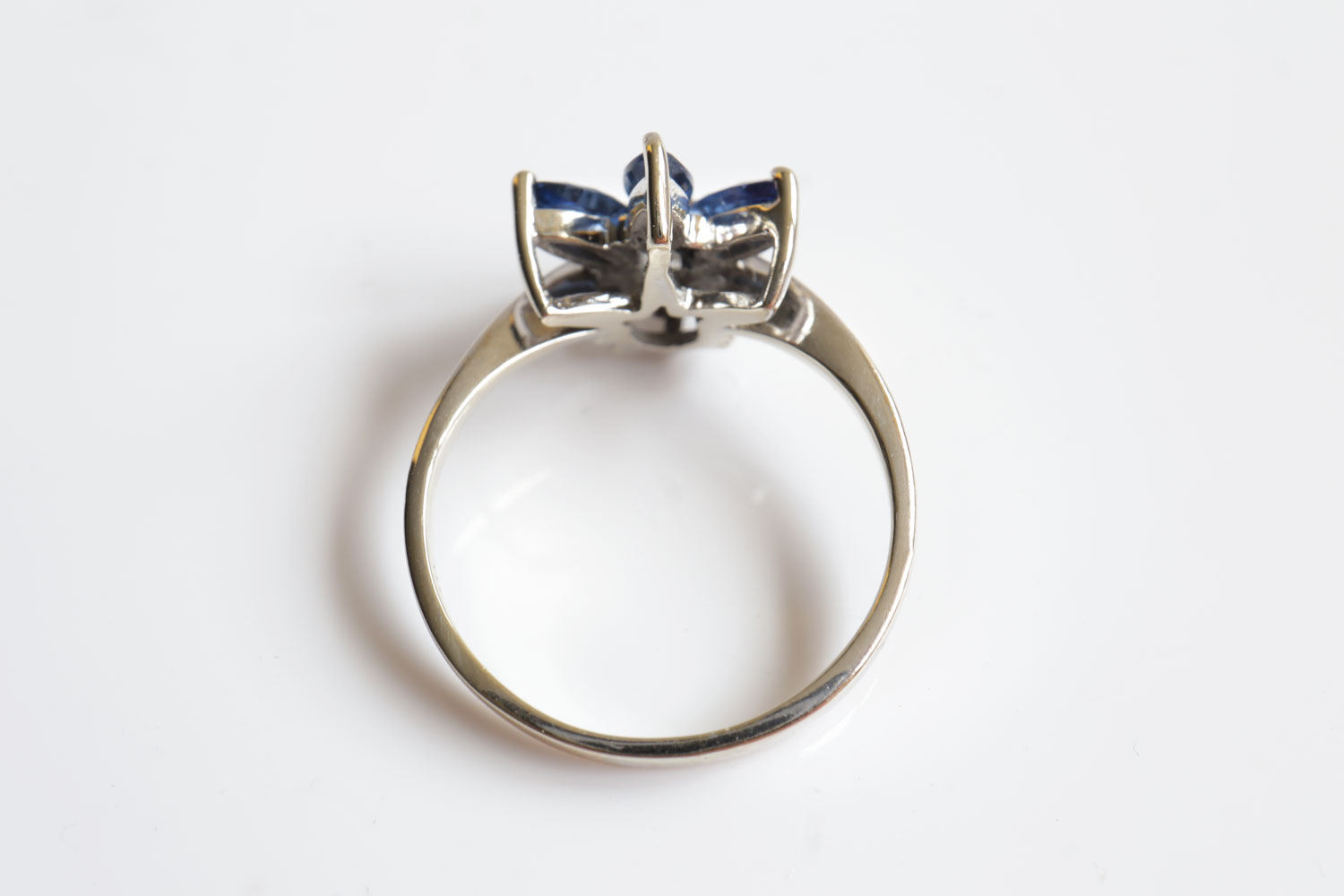 Deze bloemvormige ring straalt van sierlijkheid en vrouwelijkheid. Maar ook door de 0.06 karaat diamanten en de diepblauwe Saffier, die voor wijsheid en trouw staat.