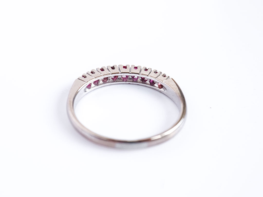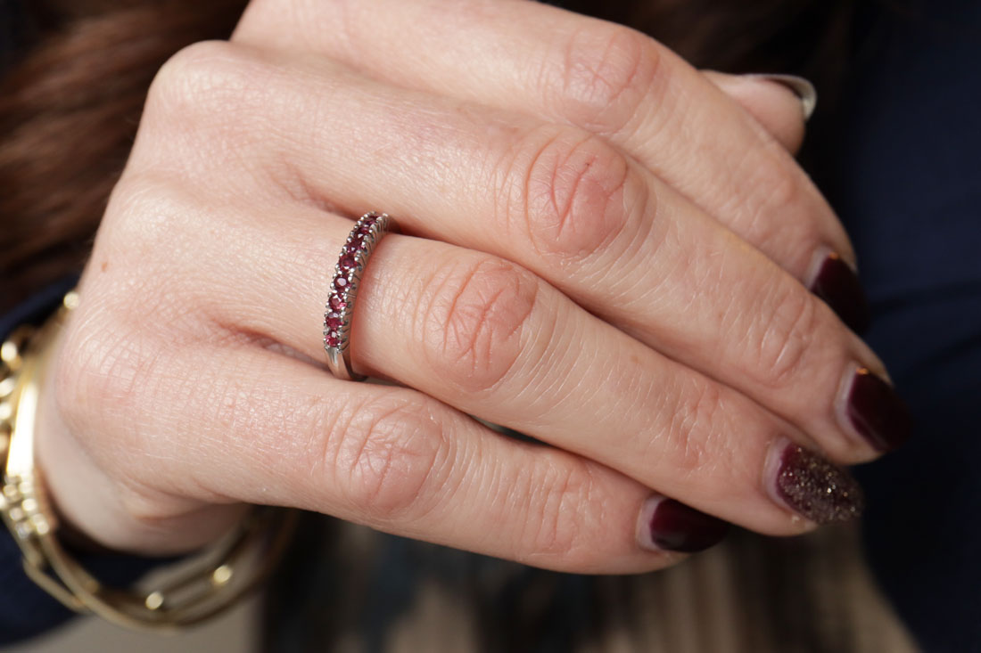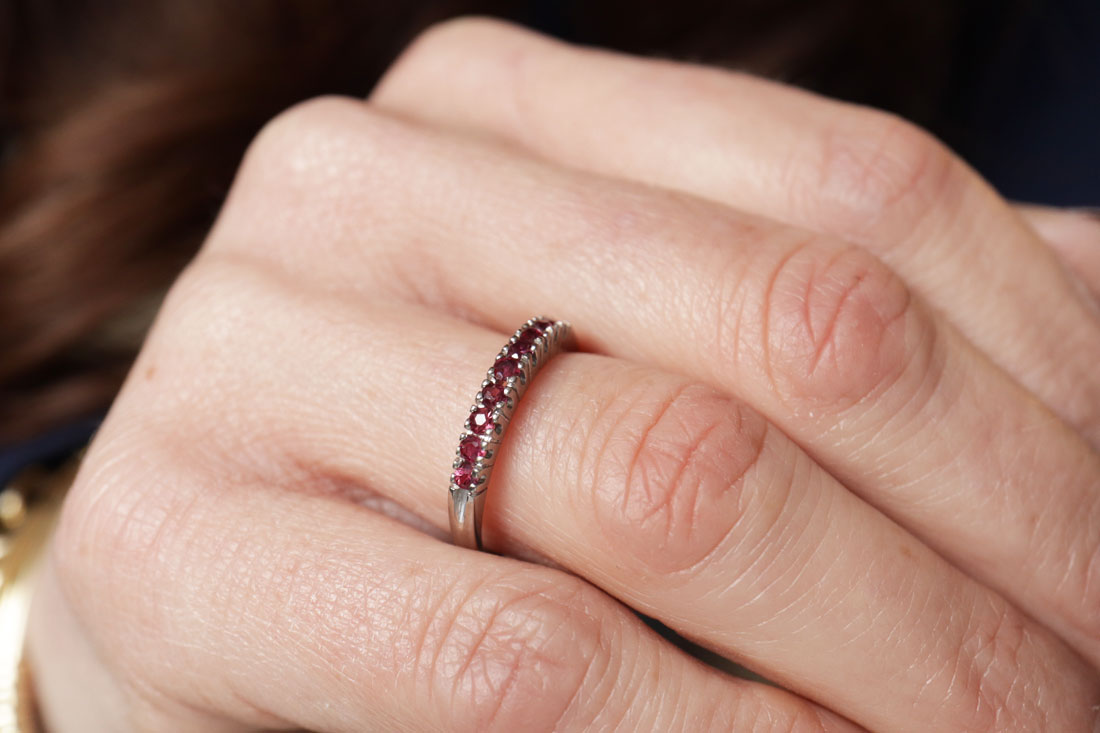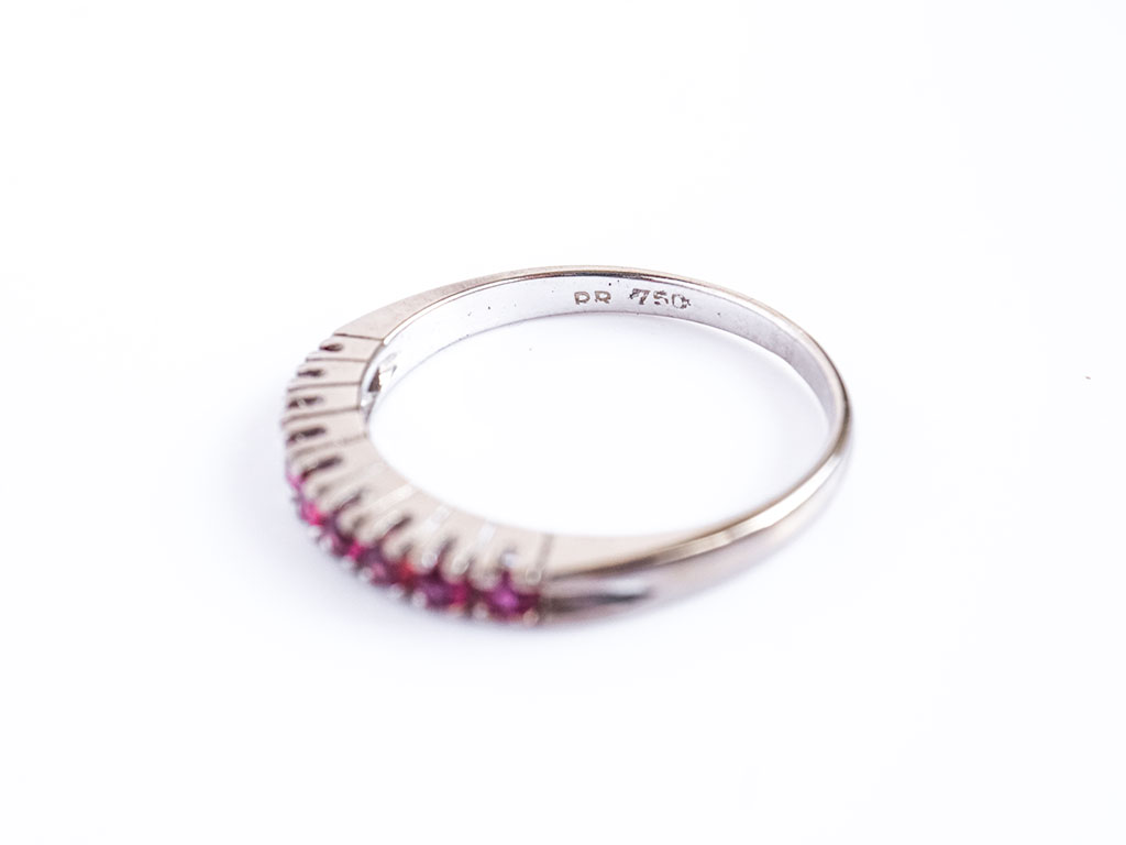 Deze 14 karaat witgouden rijring met robijnen geeft op een subtiele manier kleur aan je sieradencollectie.
