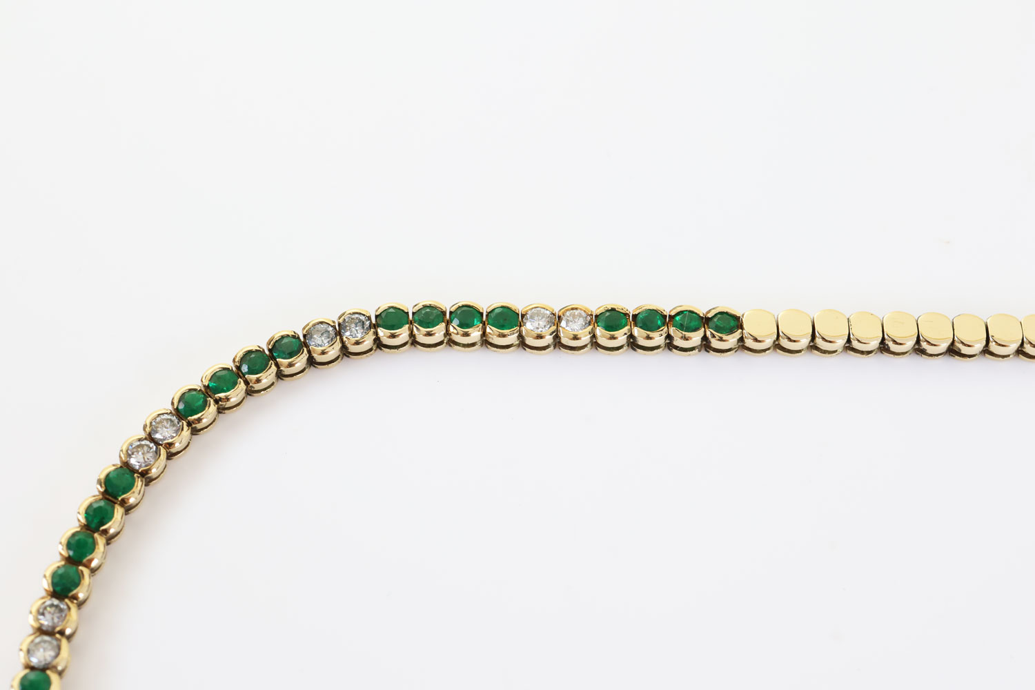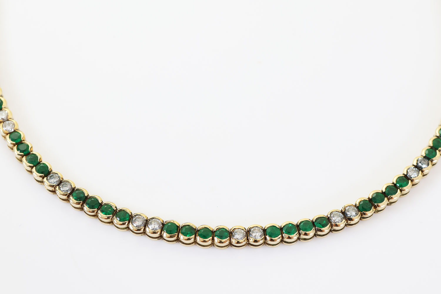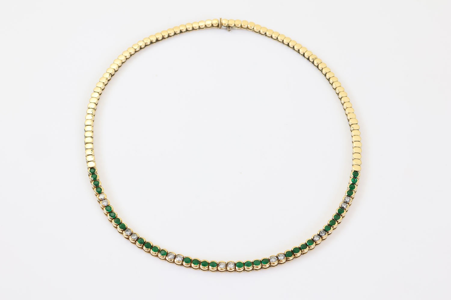 Pure Luxe! Dit exclusieve 18 karaat gouden collier is bezet met diamanten en smaragd edelstenen. Door de lengte van 40,5 cm valt hij prachtig hoog om de hals.