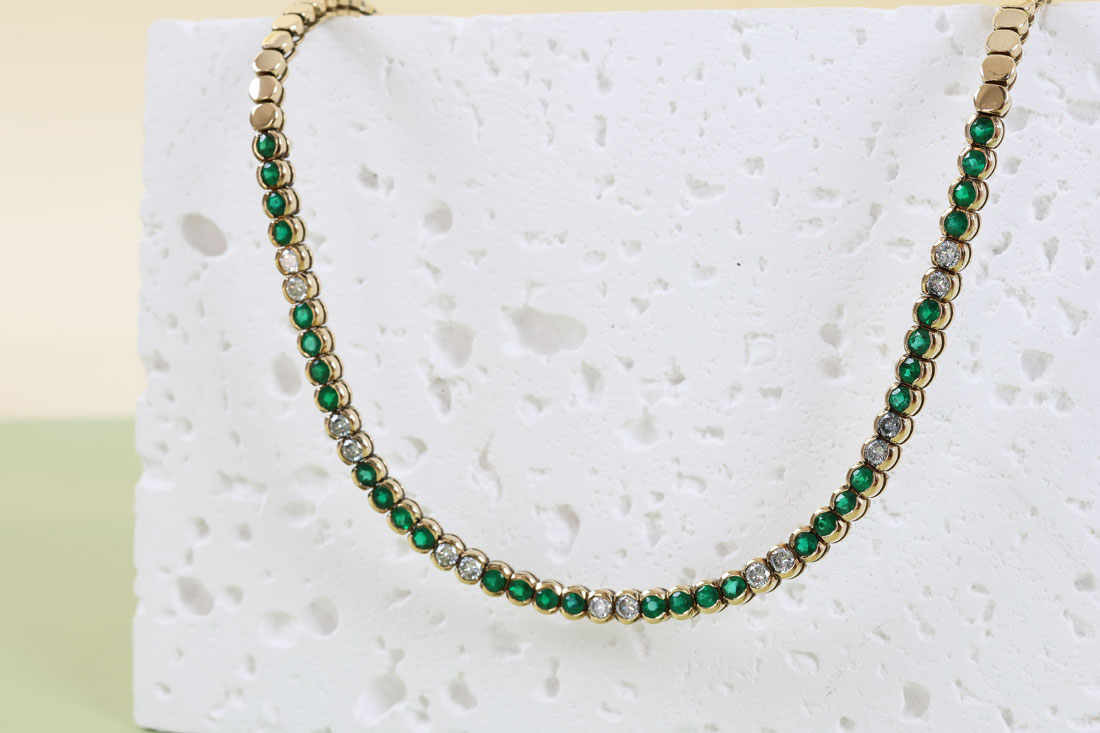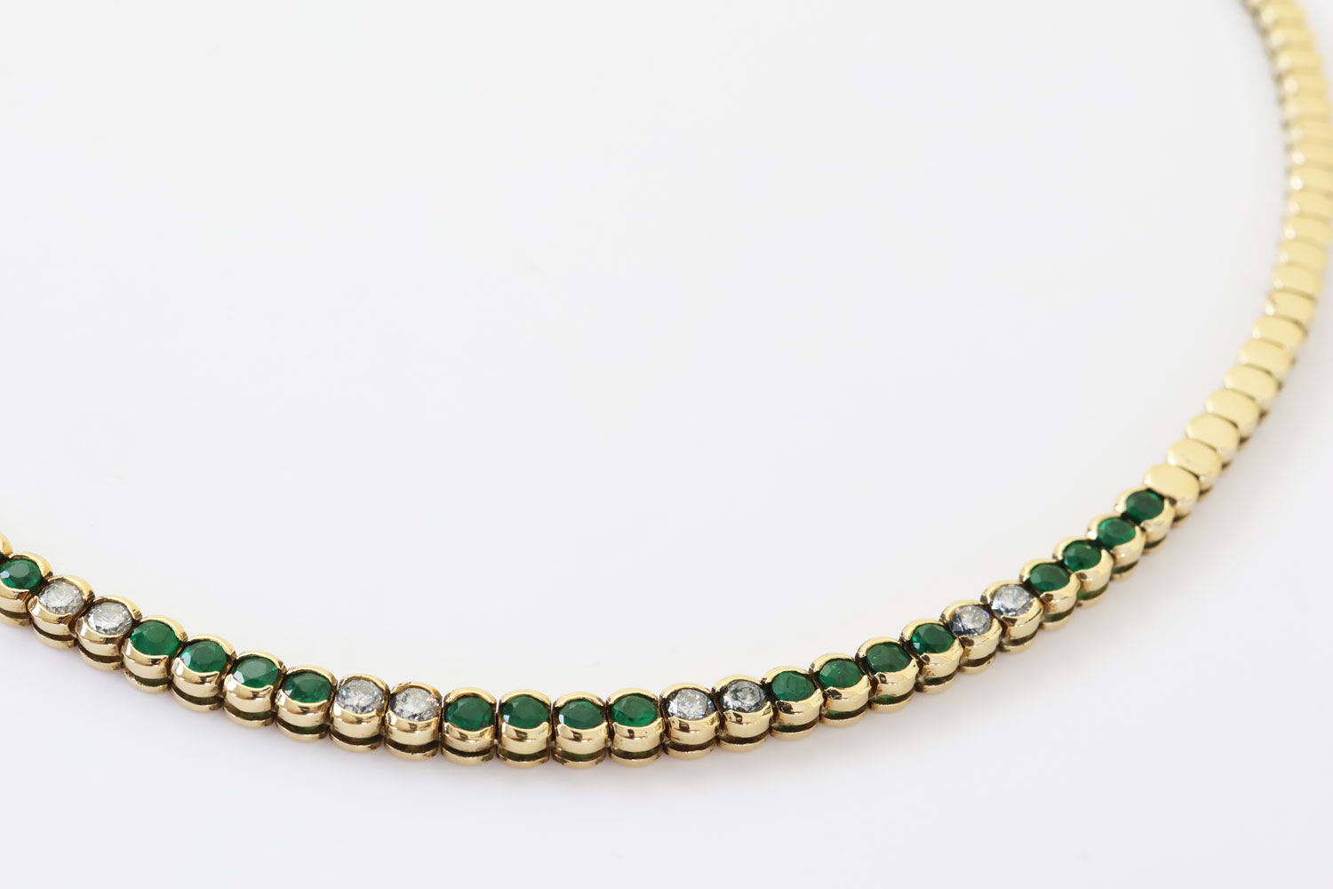 Het collier is gezet met maar liefst 1.40 ct diamanten, die zorgen voor schitterende reflectie en extra luxe. De intens groene smaragden vormen een prachtig contrast met de diamanten en het goud, waardoor een klassiek en exclusief geheel ontstaat.