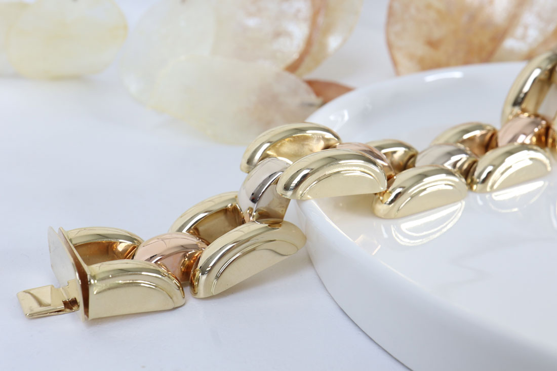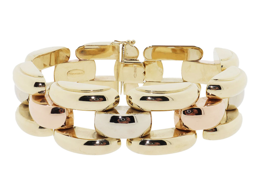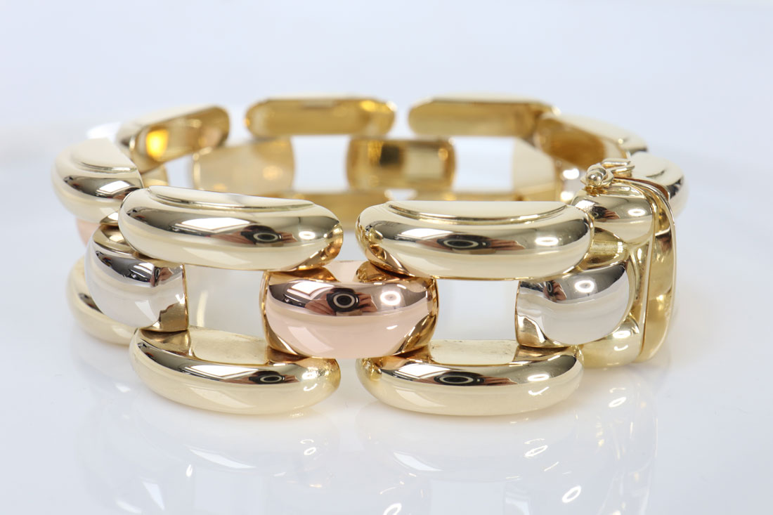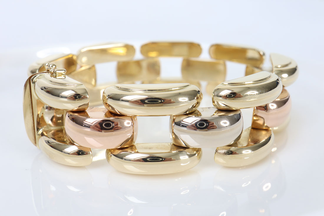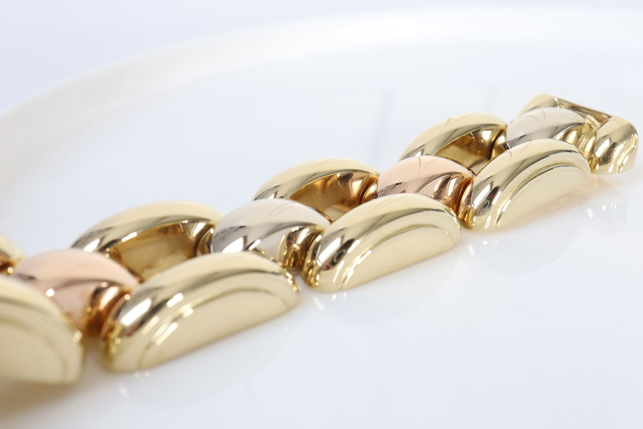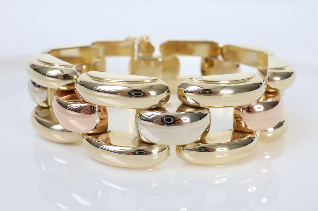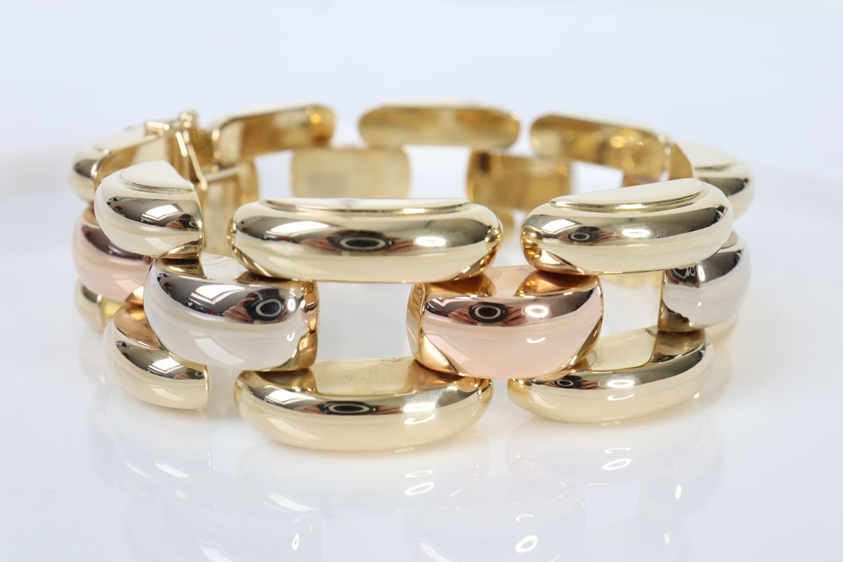 Exclusieve 18 karaat gouden tricolor dames armband. Dit is een statement piece pur sang!