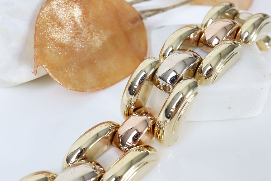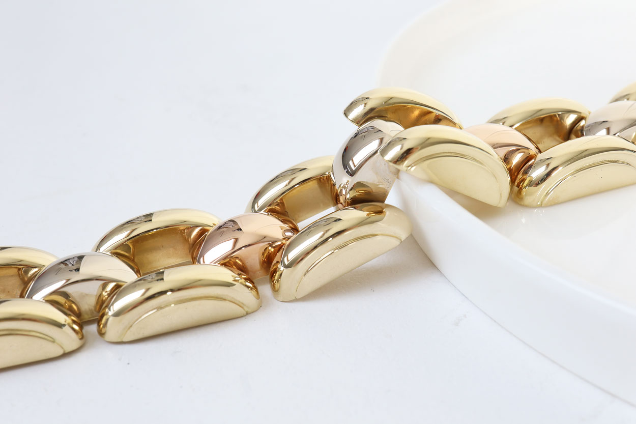Een groot voordeel van het tricolor ontwerp is de eindeloze combineerbaarheid. Deze armband laat zich moeiteloos dragen naast andere gouden sieraden, ongeacht hun kleur. Of je nu geelgoud, witgoud of roségoud draagt — deze armband verbindt alles tot één stijlvol geheel. Tegelijk is zij sterk genoeg om ook solo gedragen te worden als ultiem statement.