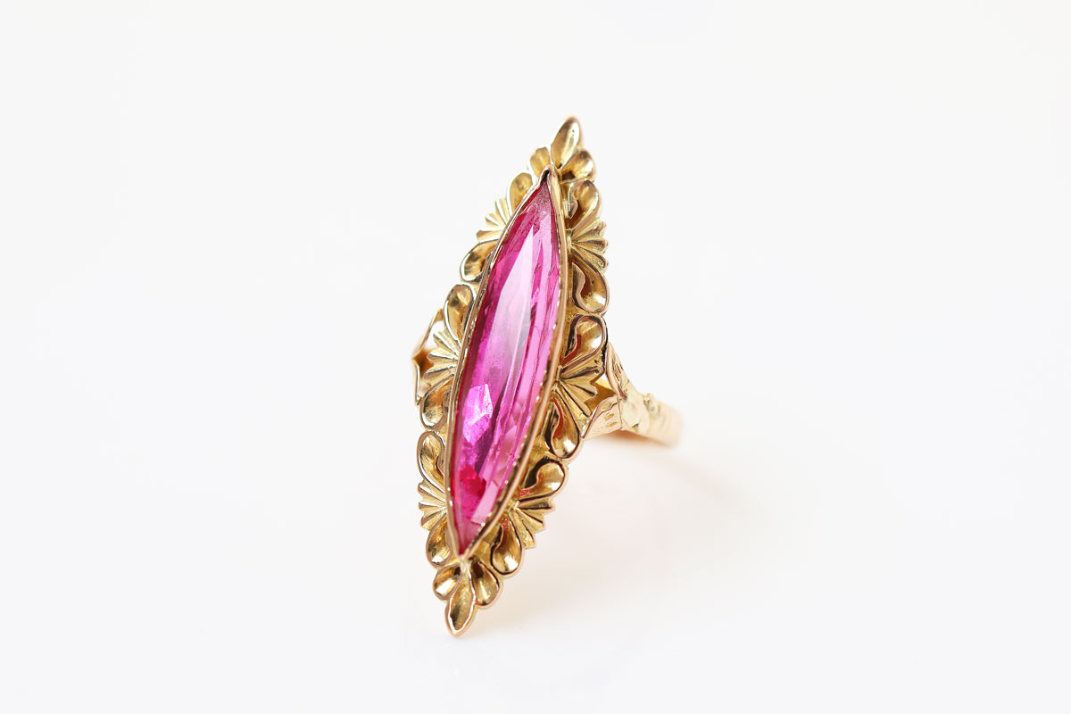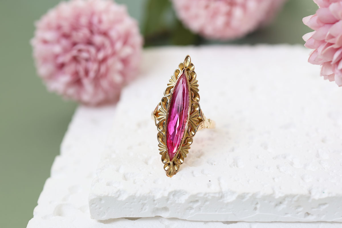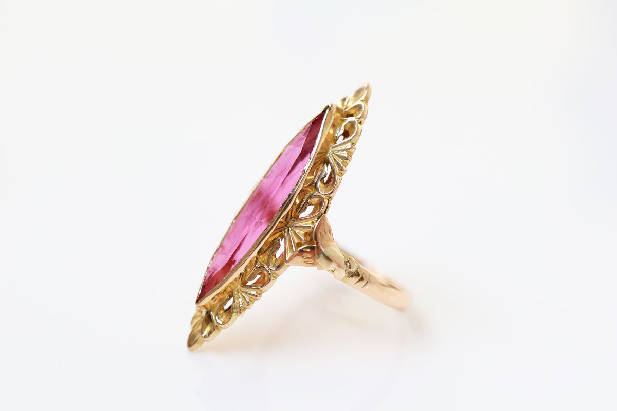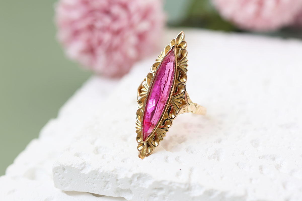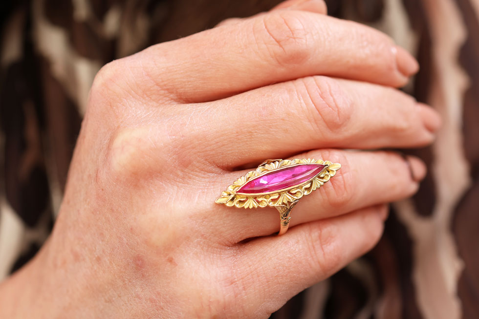Deze 22 karaat vintage gouden ring met marquise robijn spat van je vinger af. De kleur van de robijn is zo intens roze dat het een prachtig contrast geeft met het geelgoud.