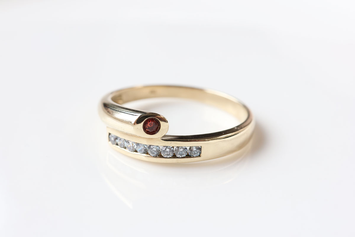 Z334-3356Deze 8 karaat ring met zirkonia en robijn heeft een modern en speels ontwerp dat direct opvalt.