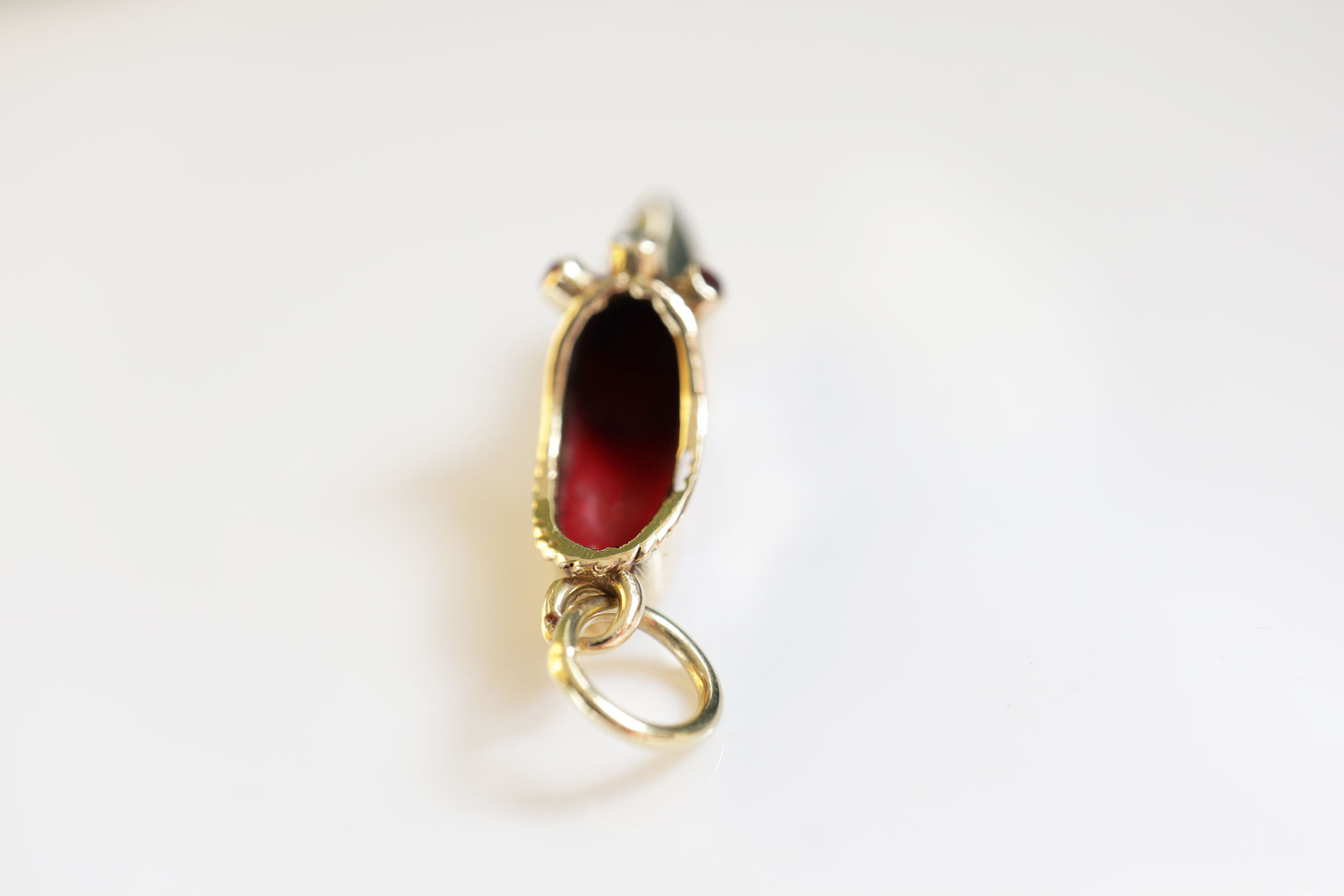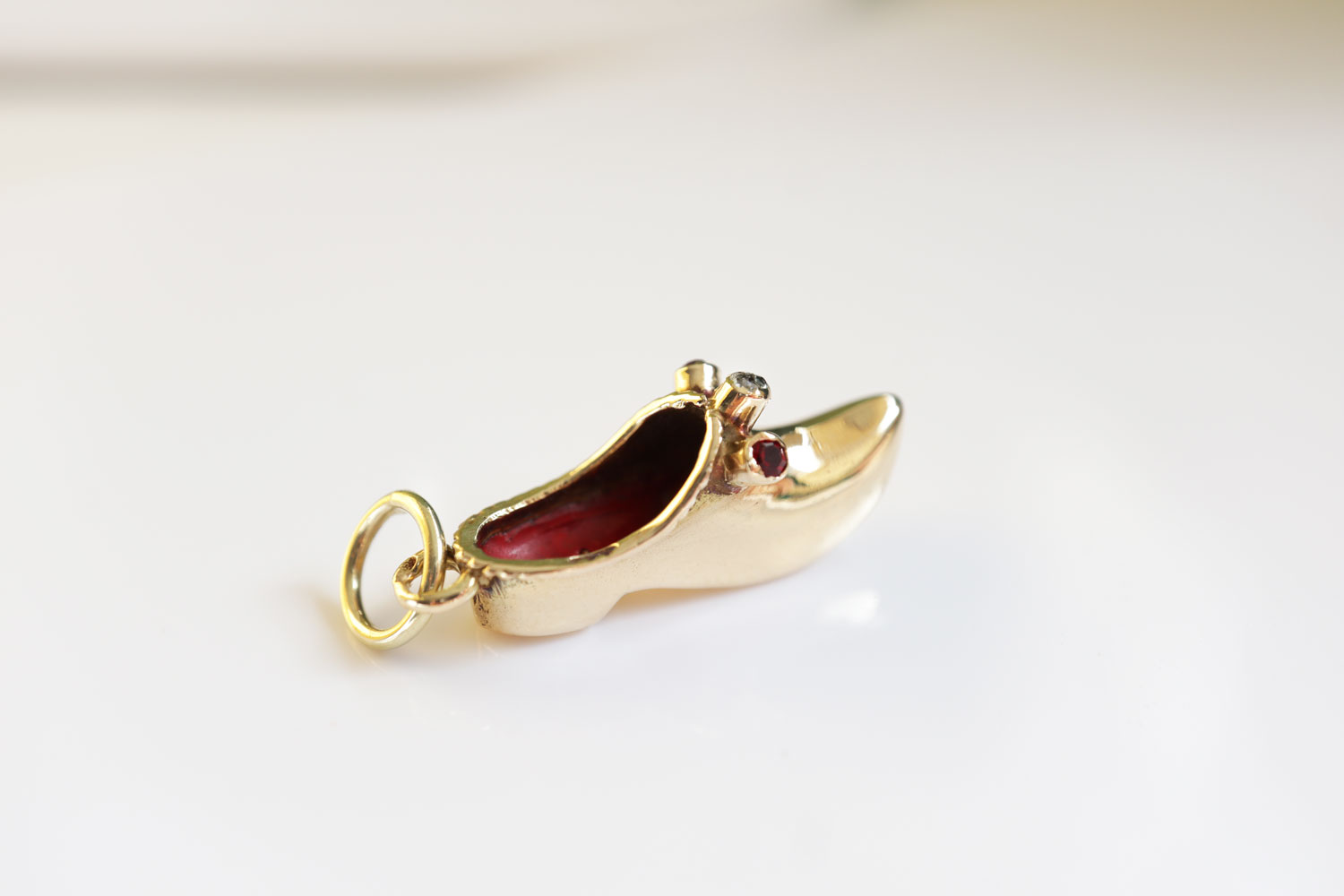 Babouche - het traditionele arabische schoentje! Hoe leuk in de vorm van een hanger?! Dit is echt een handgemaakt kunstwerk tot in detail. Aan de voorzijde is hij gezet met granaat edelstenen en een zirkonia. De binnenkant is rood emaille.