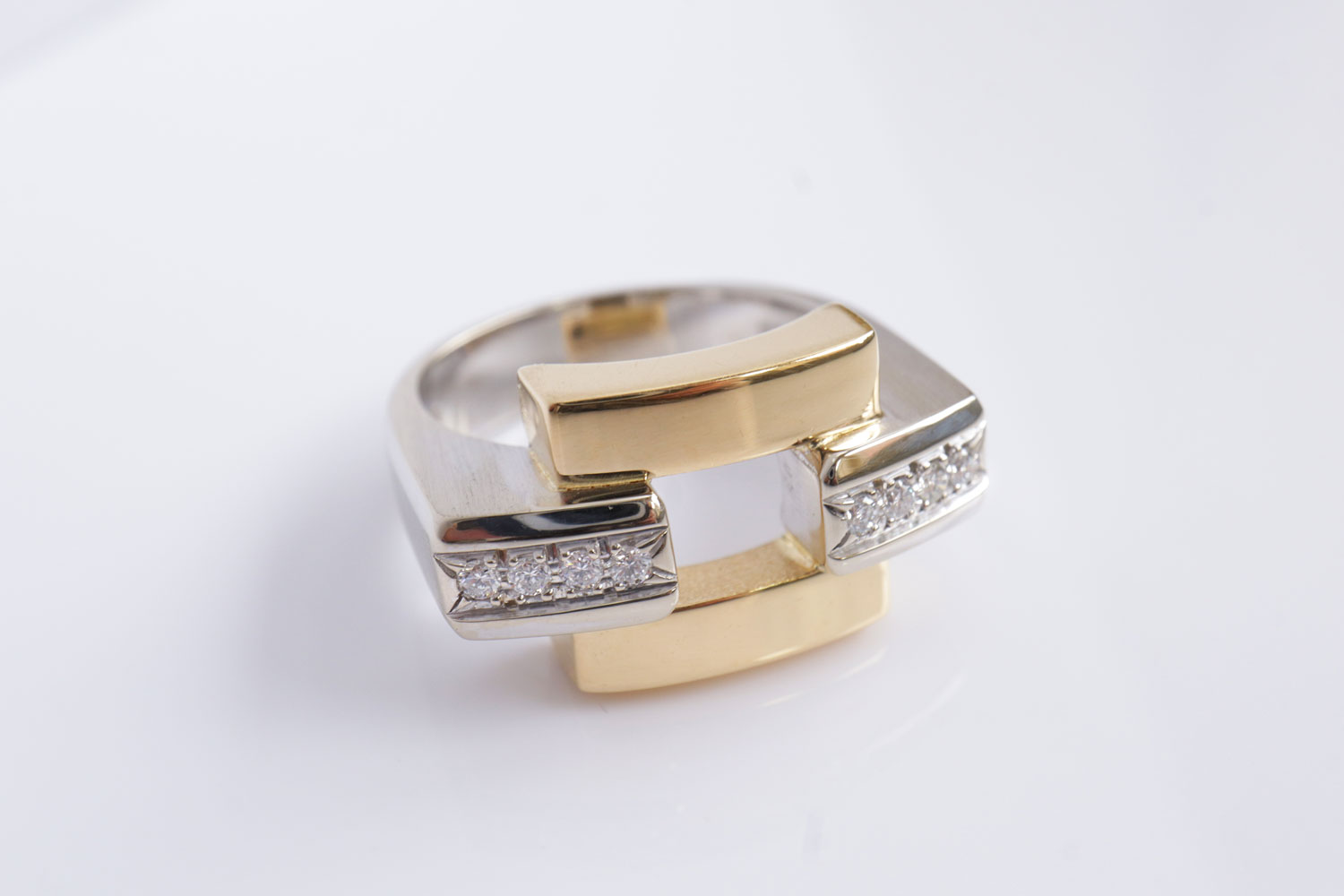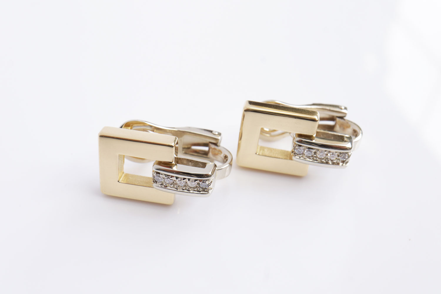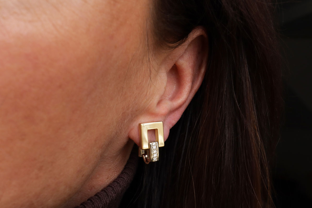 Met rechte lijnen, vierkante en rechthoekige vormen en briljant geslepen diamanten, is deze bicolor set een en al moderne elegantie . Het totaalgewicht van de set is 147 gram, wat zorgt voor een luxe uitstraling.