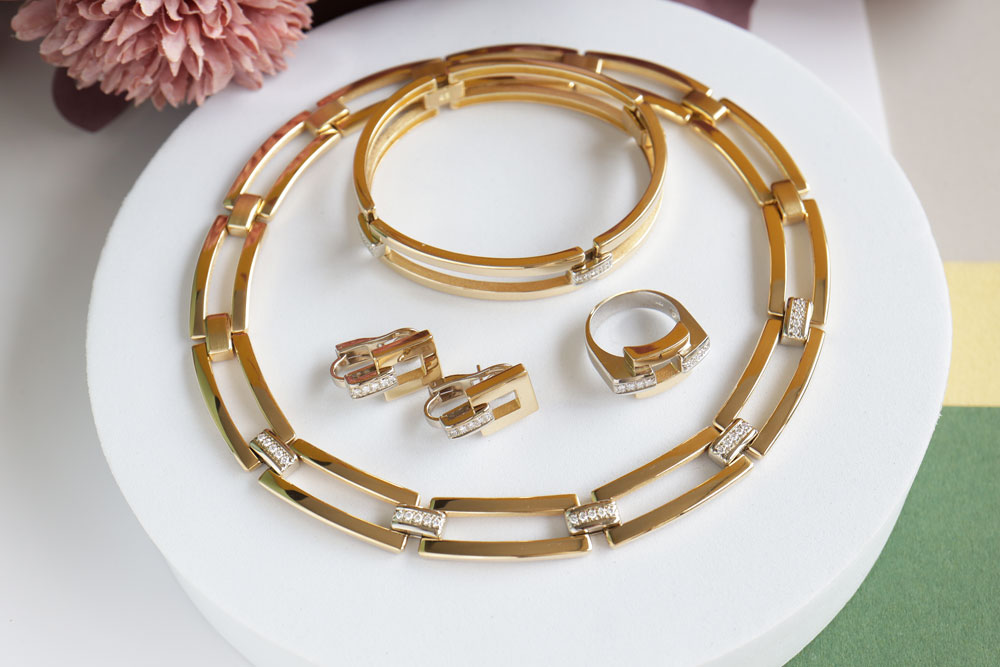 Pure luxe in zijn mooiste vorm, wat een waanzinnige set. Deze set omvat 147 gram vakmanschap, 18 karaat goud en briljant geslepen diamanten. Speciaal voor de vrouw die alleen het allerbeste kiest.