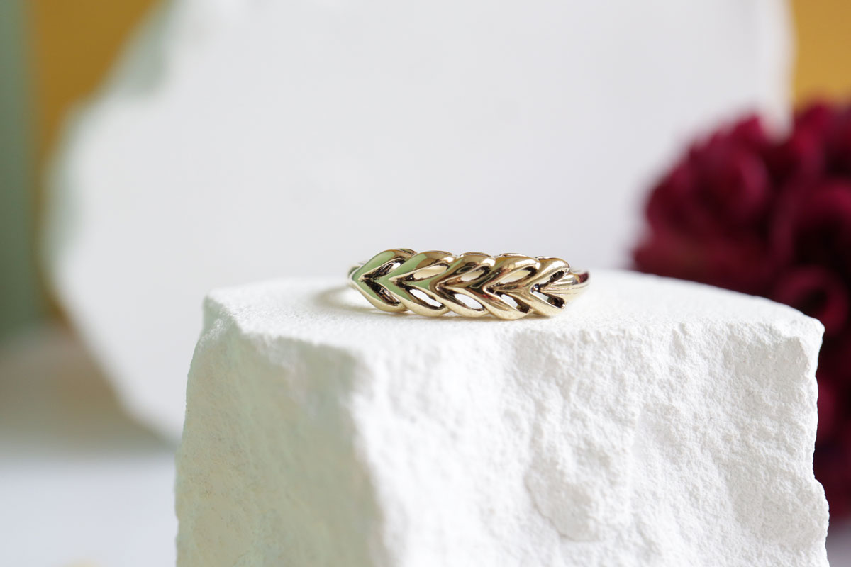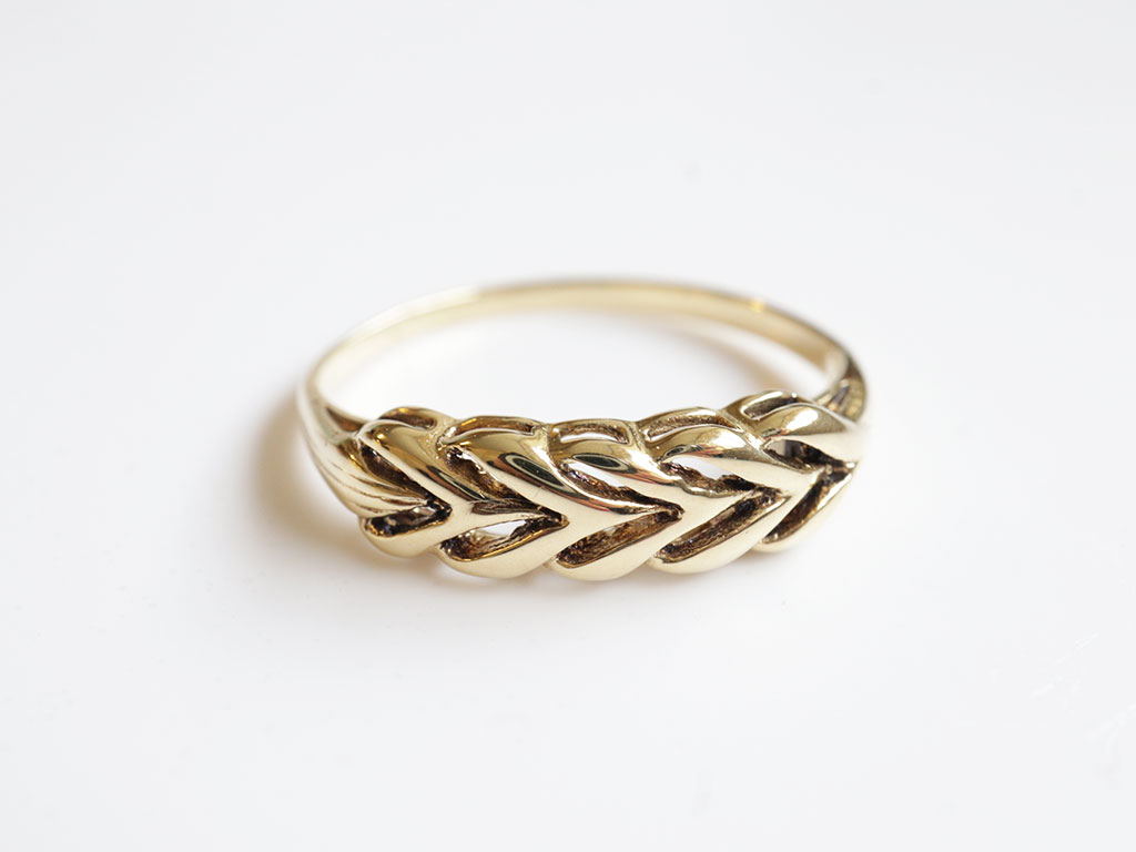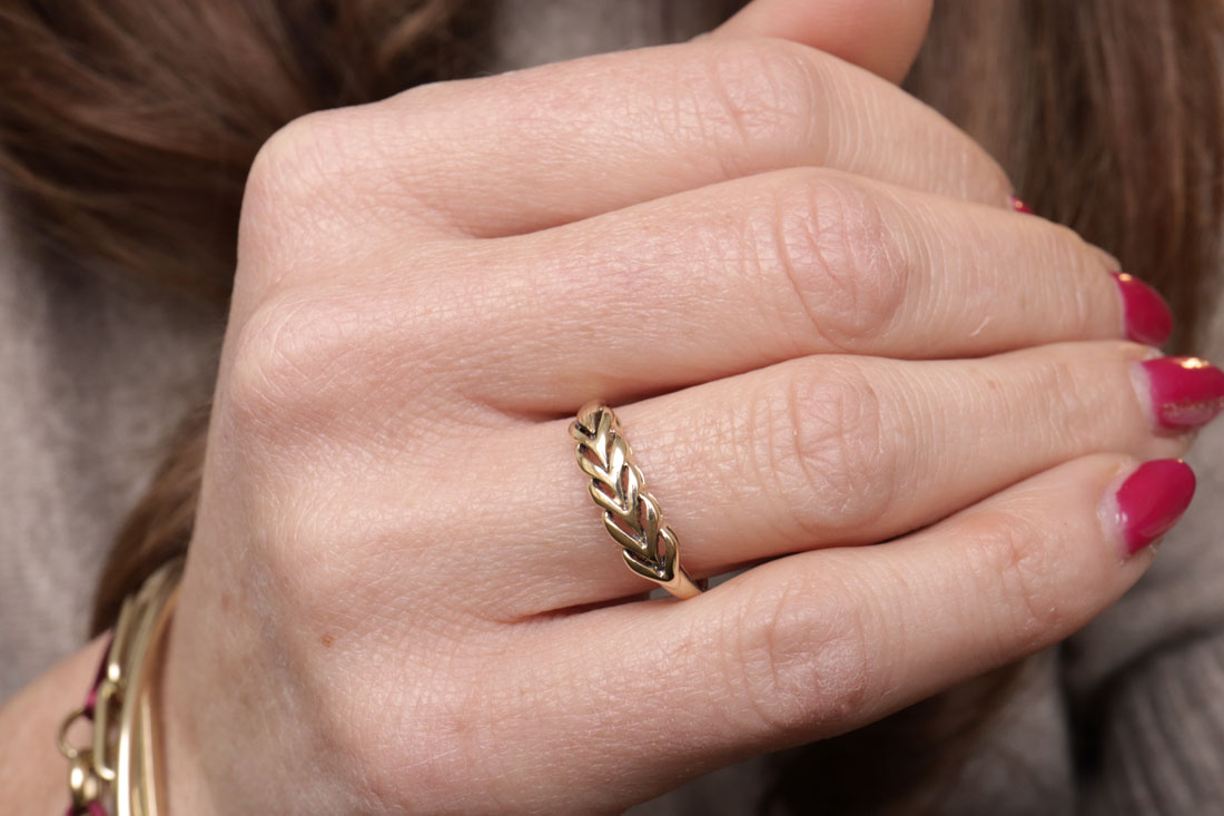 Z311-3126In de voorkant van deze gouden dames ring zien wij een vlecht. Een symbool van verbondenheid en harmonie. Het ontwerp is anders dan anders, maar super elegant. Hierdoor is deze 14 karaat gouden ring een tijdloos sieraad, die heel mooi alleen te dragen is maar ook gecombineerd kan worden met andere ringen.