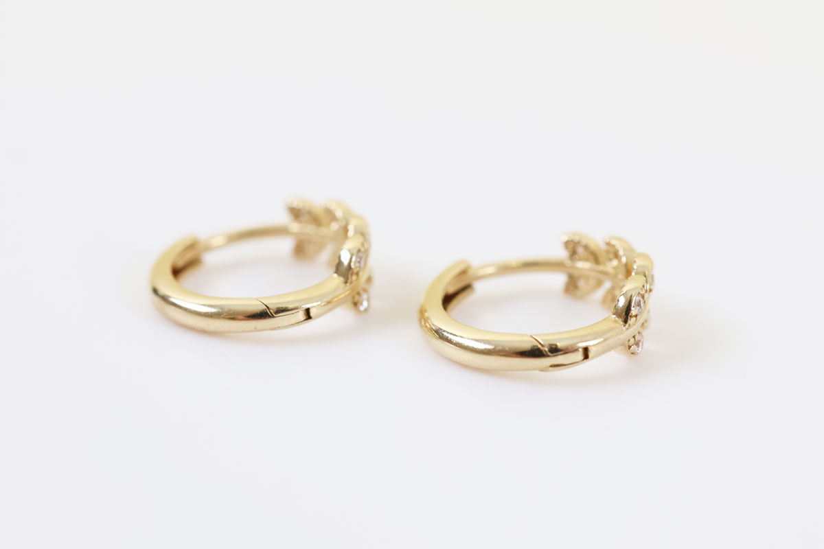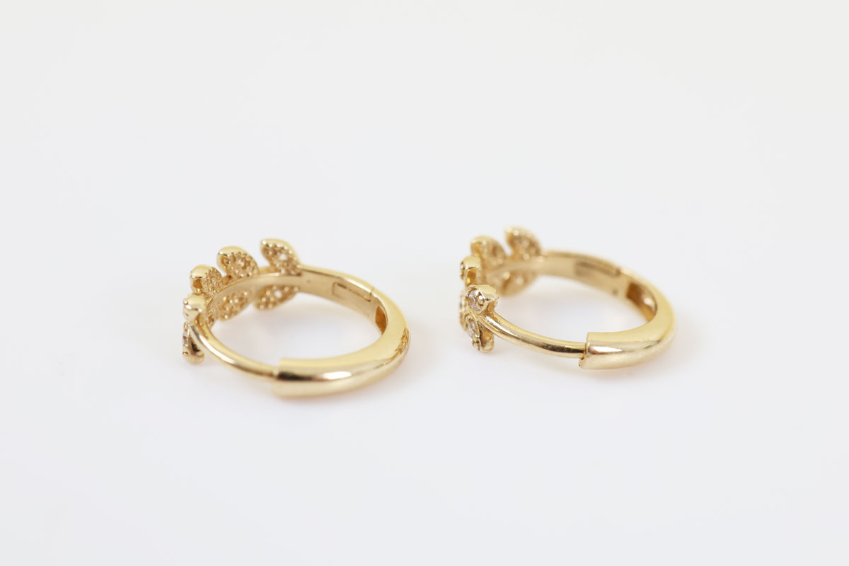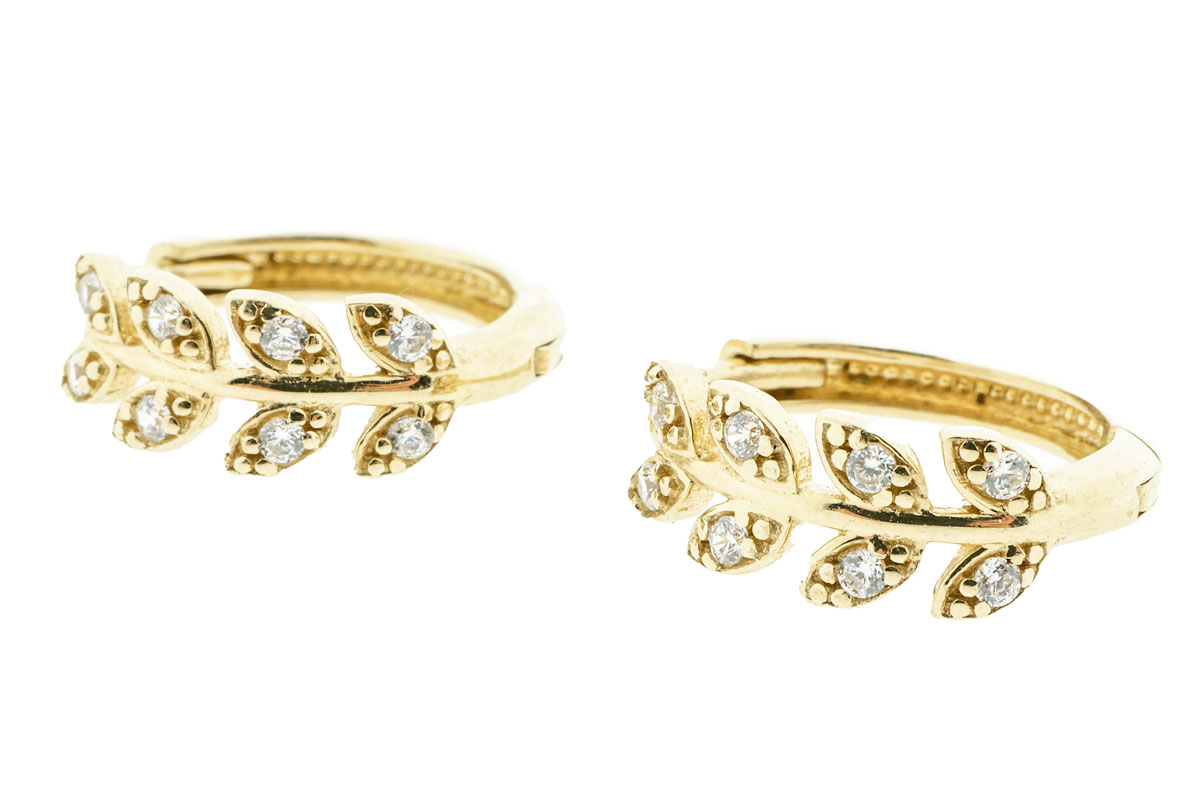 Z337-3387Deze 14 karaat gouden oorbellen met zirkonia hebben een verfijnd en vrouwelijk ontwerp. De oorbellen zijn vormgegeven in een sierlijk blaadjesmotief, waarbij kleine zirkonia steentjes subtiel zijn verwerkt in het ontwerp.