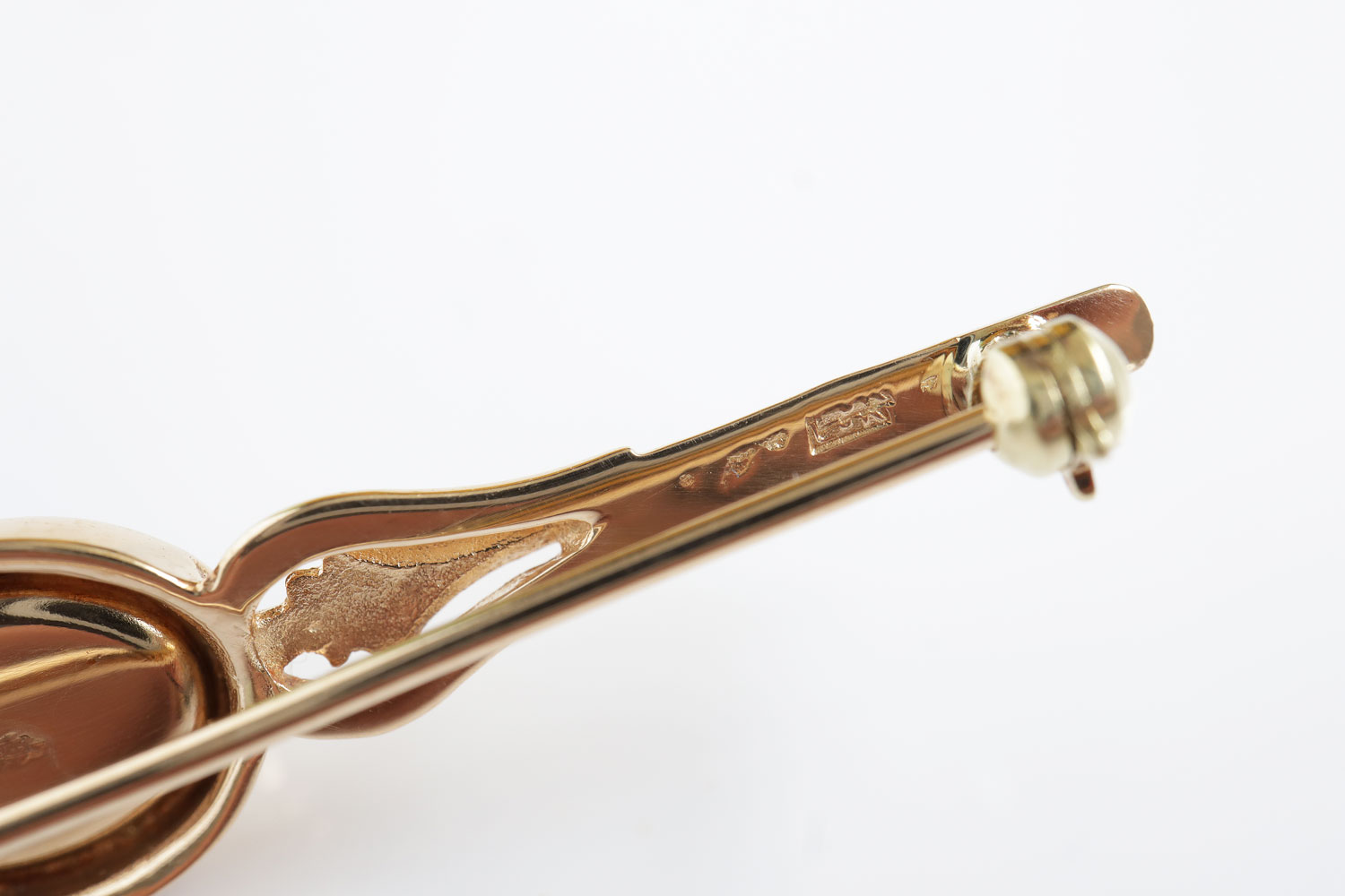 Prachtige gouden broche met knalroze toermalijn edelsteen. De broche is gemaakt van 14 karaat geelgoud en door de Toermalijn valt hij prachtig in het oog.