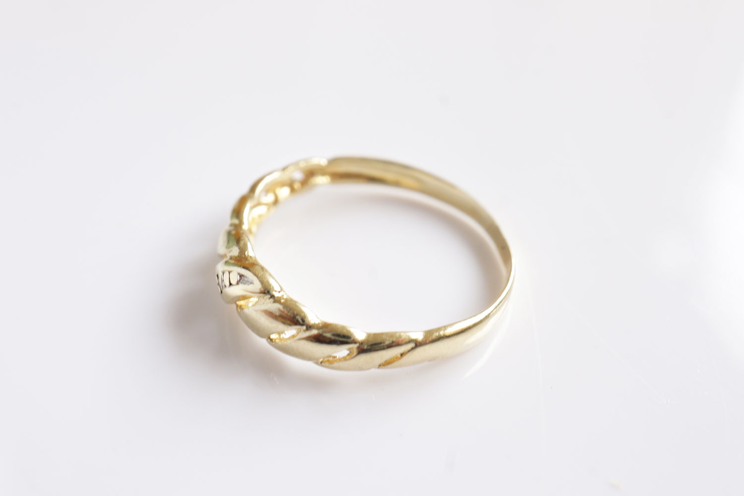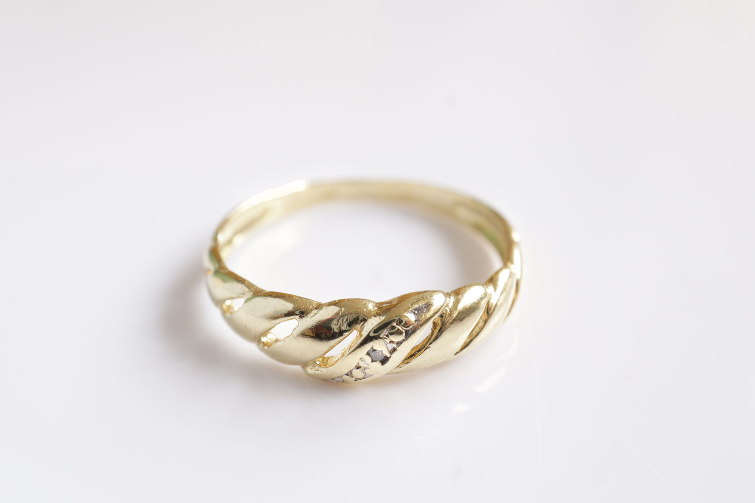 Z324-3257Deze mini croissant ring van 14 karaat goud is een subtiele eyecatcher met een speelse, luxe uitstraling. Het ontwerp is geïnspireerd op de herkenbare, zachte ribbels van een croissant: rond, vloeiend en elegant. In het midden schittert een klein diamantje, dat precies genoeg sprankeling toevoegt zonder de ring te overheersen.