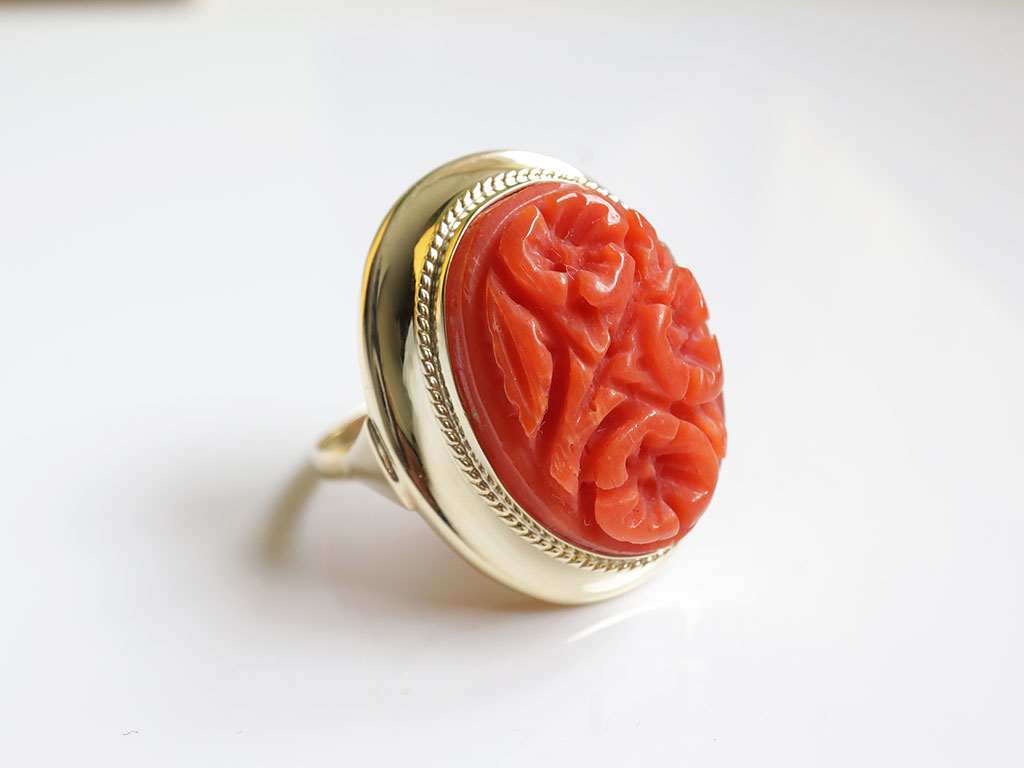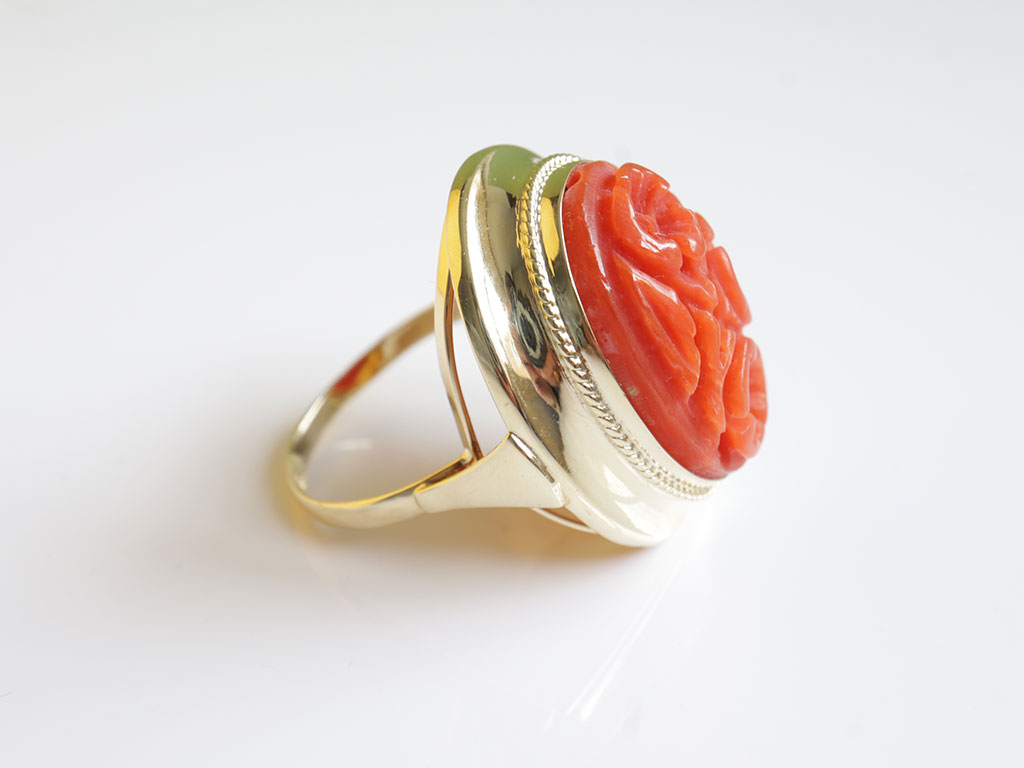 Z300-3010Deze gouden ring is gemaakt van 14 karaat en gezet met een bloedkoraal. Deze is helemaal met de hand gesneden in een bloemmotief. Met een breedte van 25 mm aan de voorkant is het een ware eyecatcher, maar door de zachte kleuren blijft hij vrouwelijk en subtiel.