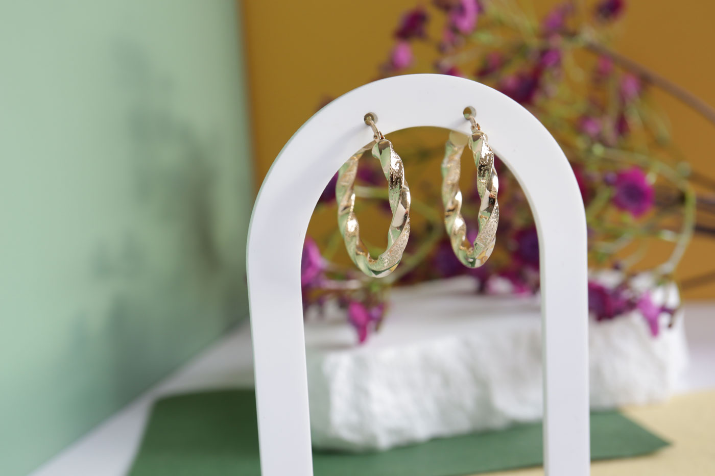 En doordat de oorbel gedraaid is, wisselen beiden elkaar af zodra je beweegt. Het resultaat? Een effect dat nooit verveelt.