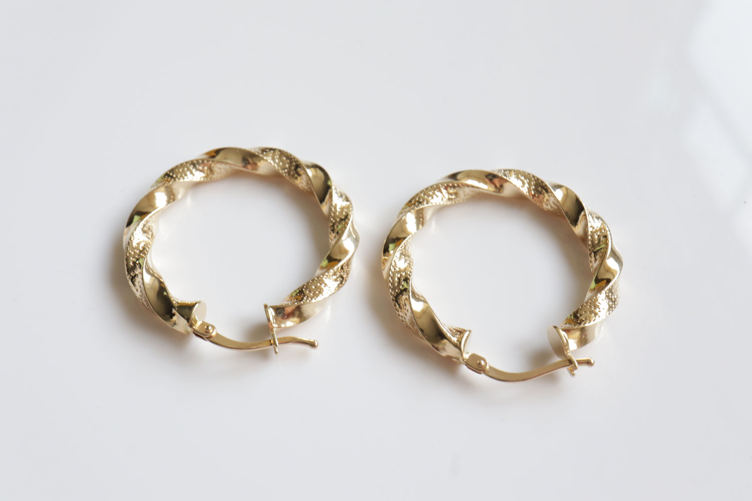 Middelgrote 14K creolen (27,5 mm) met speels gedraaid ontwerp — één zijde met meander-patroon, de andere zijde hoogglans. Tijdloos, luxe en perfect voor iedere gelegenheid.