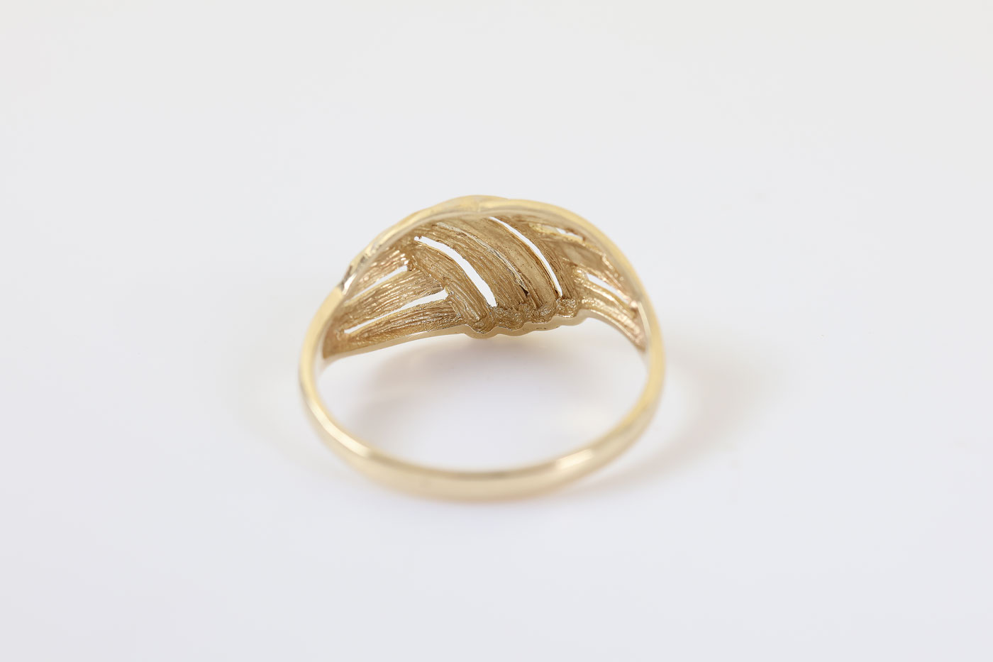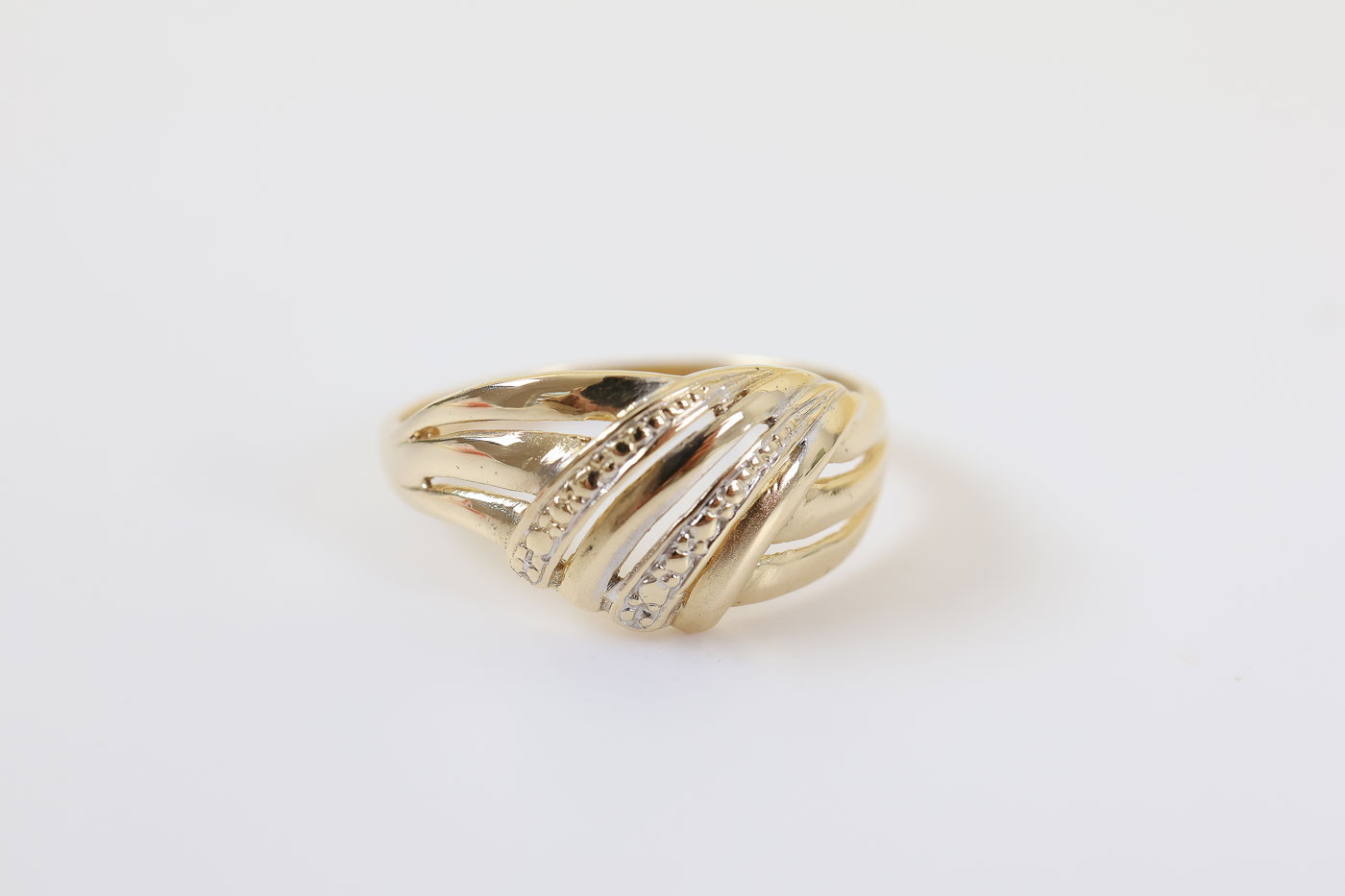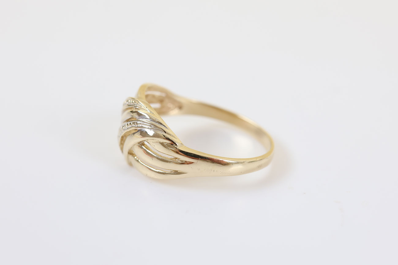Z334-3354Deze 14 karaat gouden ring valt direct op door het speelse, gedraaide ontwerp. De verschillende banen lopen sierlijk over elkaar heen.