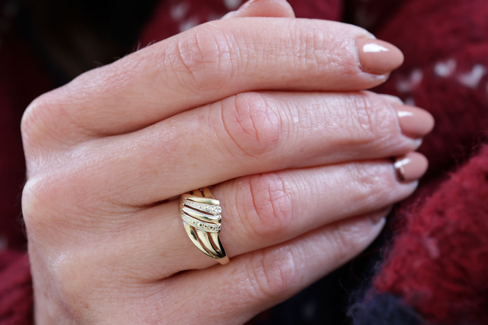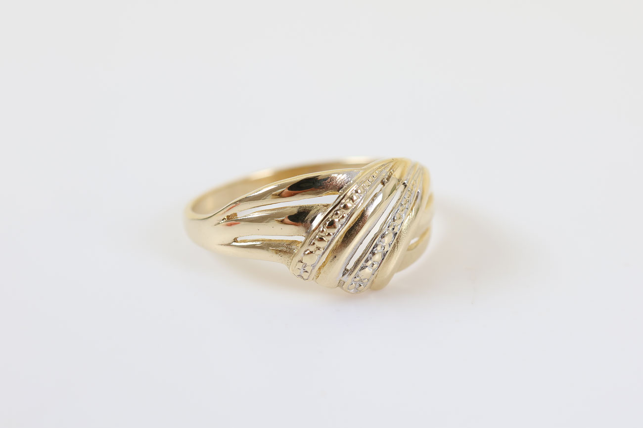De combinatie van geelgoud met subtiele witgouden accenten geeft de ring een bicolor uitstraling, waardoor hij gemakkelijk te combineren is met andere sieraden.