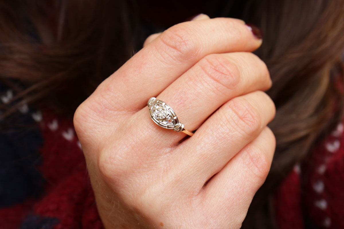 De combinatie van warm geelgoud en koel platina zorgt voor een sterk visueel contrast, typisch voor sieraden uit het Art Deco tijdperk. De diamanten zijn geplaatst in een decoratieve, bijna architectonische zetting die zowel elegant als krachtig oogt. Dit geeft de ring een uitgesproken karakter, zonder dat hij aan draagbaarheid inboet.