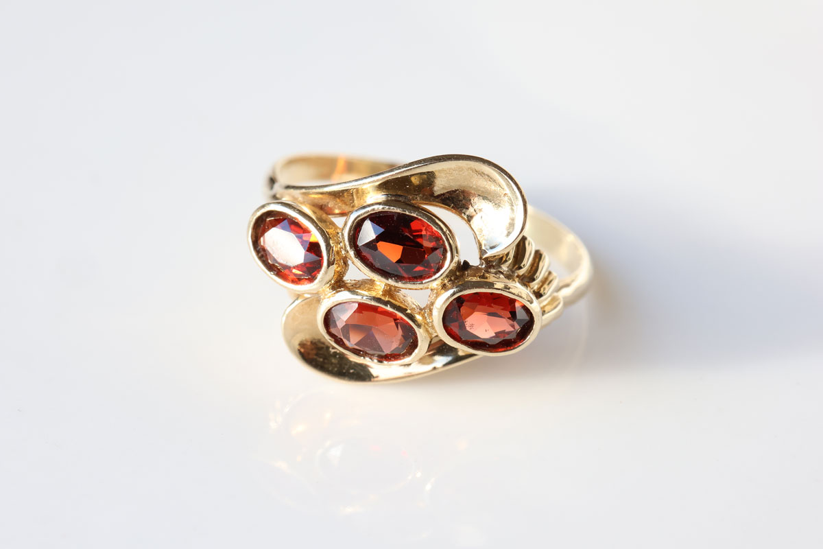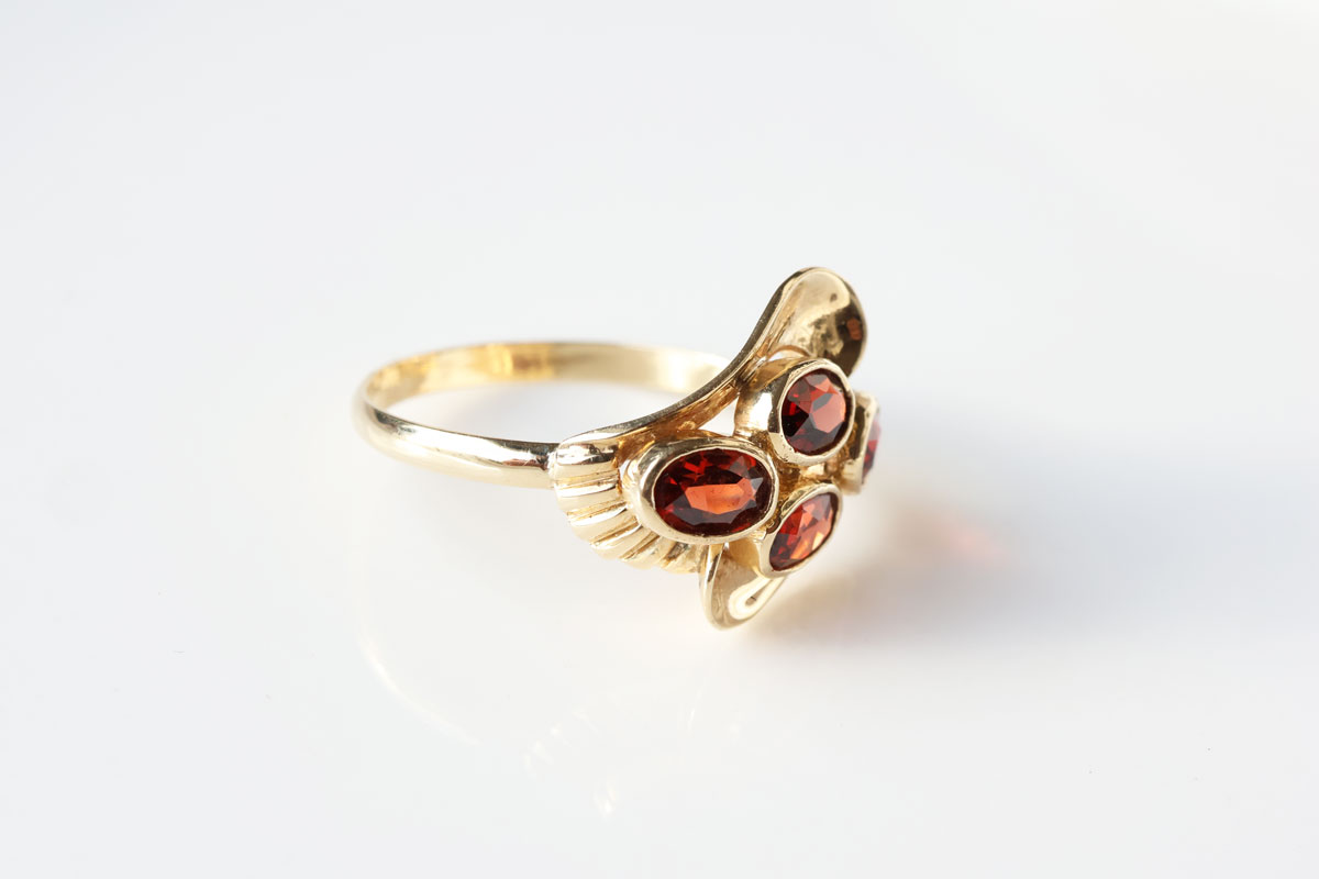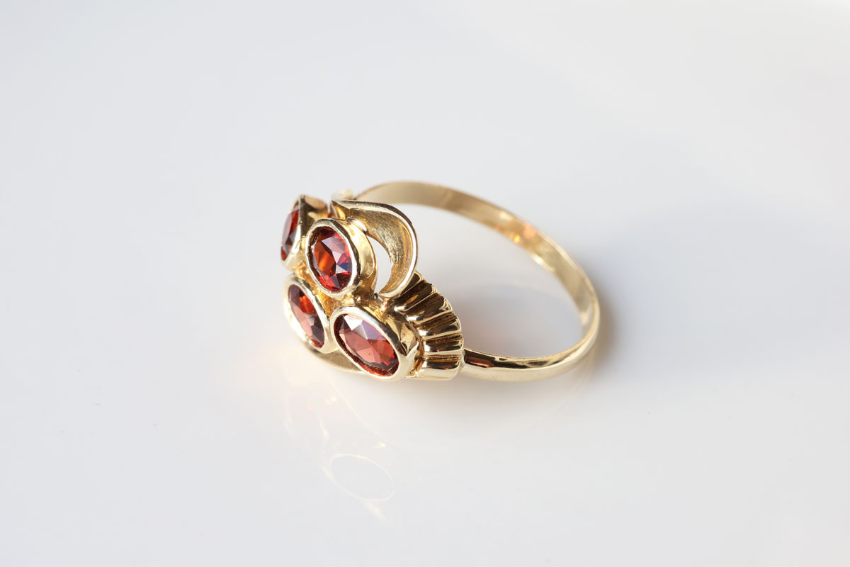 De stenen tonen verschillende nuances afhankelijk van het licht: van diep warm rood tot een zachtere oranje gloed. Daardoor verandert de ring voortdurend van karakter. In direct licht ogen de stenen helder en levendig, terwijl ze in zachter licht juist warmer en rustiger worden. Wij vermoeden dat het om citrien gaat, maar dit is niet officieel getest — daarom omschrijven we ze bewust als rood-oranje edelstenen.