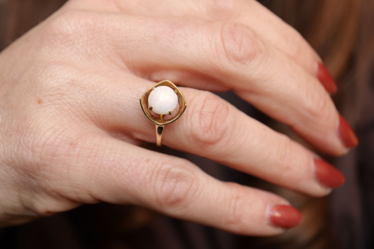 Een ring die nooit verveeld, want bij iedere blik zie je in de opaal wel weer een andere kleur verschijnen.