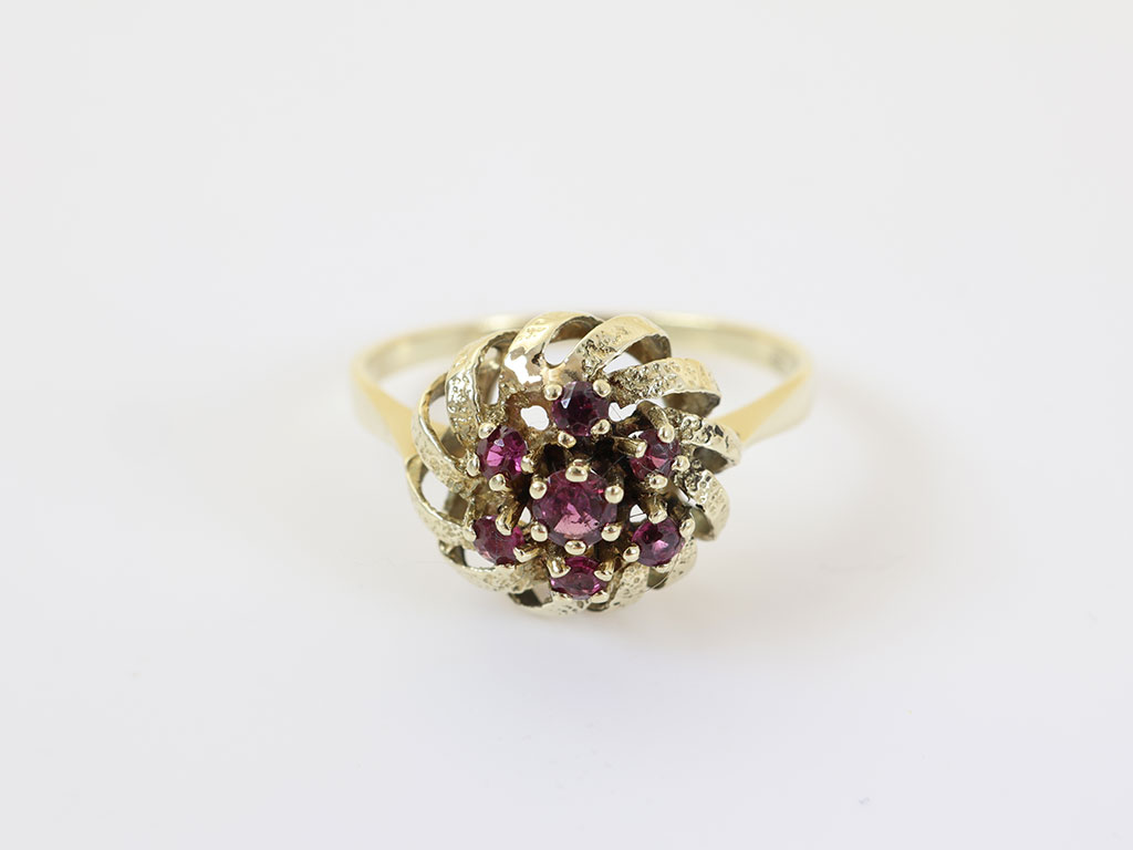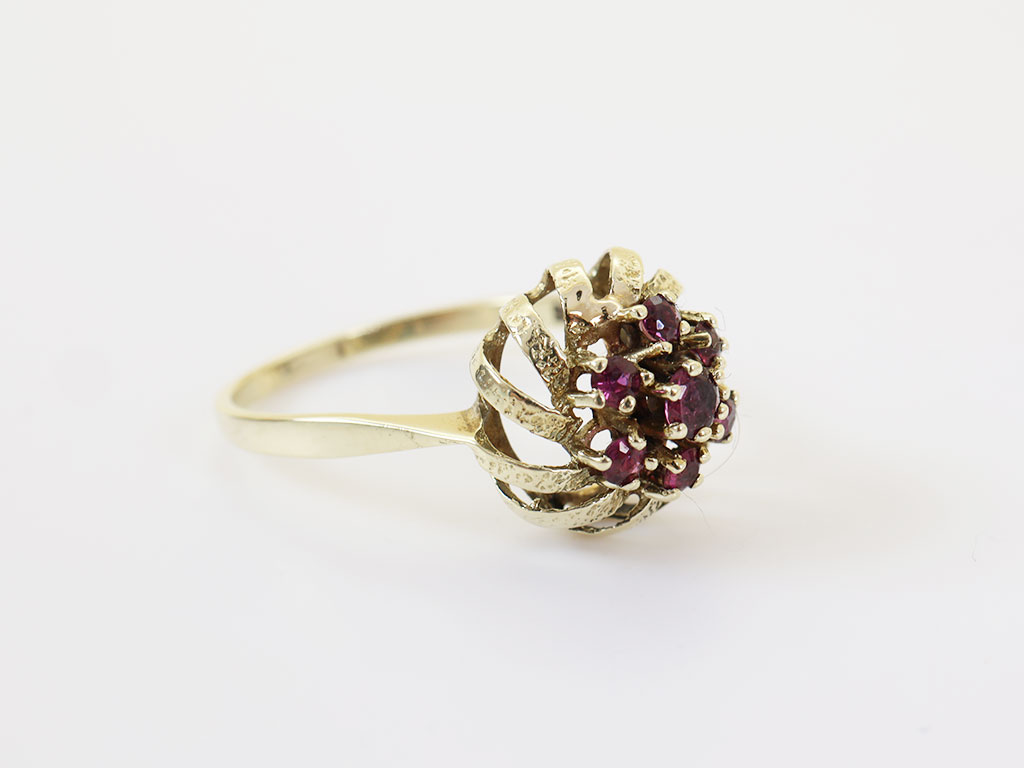 Z346-3472Deze 14 karaat gouden vintage ring met robijnen is allesbehalve standaard. Het bijzondere ontwerp combineert warme geelgouden lijnen met een rijke clusterzetting van fonkelende robijnen. De speelse opengewerkte vorm geeft de ring een luxe vintage uitstraling en maakt dit een echte eyecatcher aan de hand.