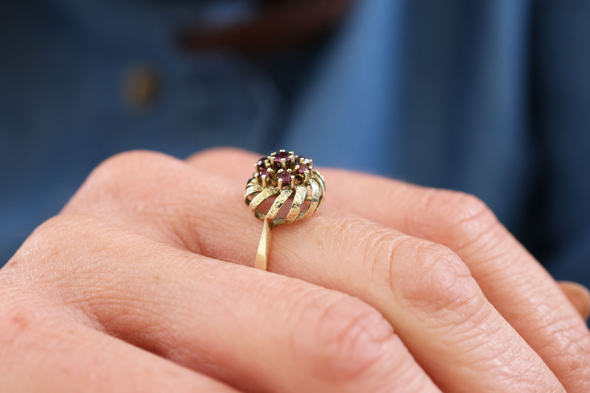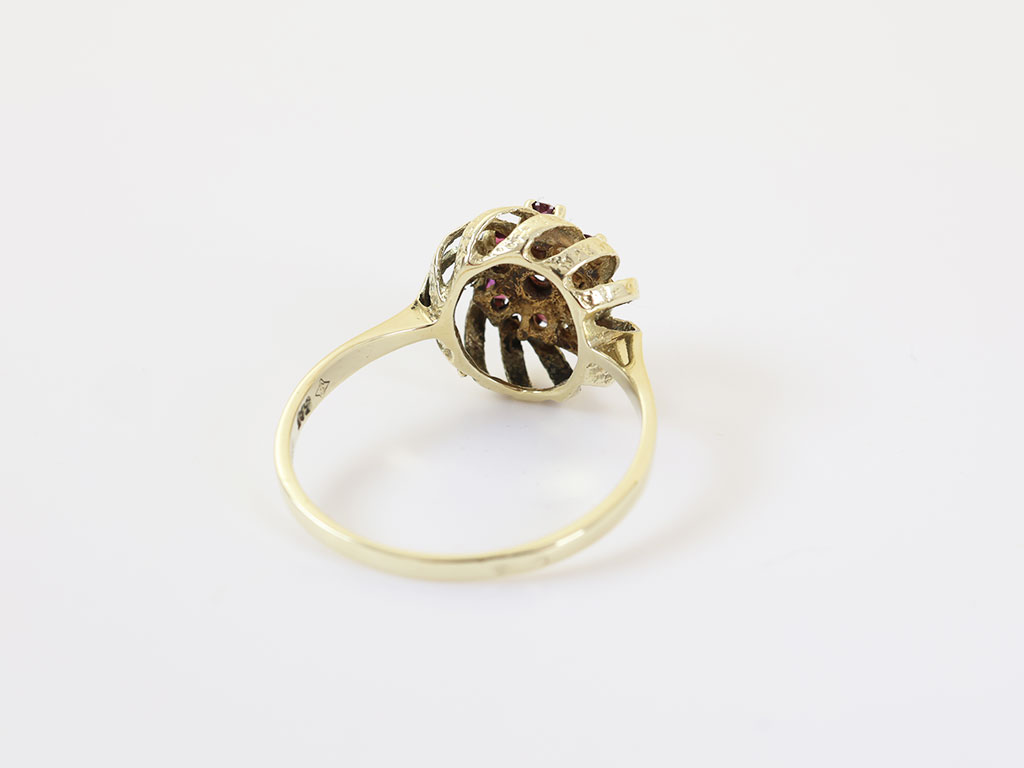 De opvallende zetting van deze vintage ring is een echte blikvanger. De ring is gemaakt van 14 karaat goud en is gezet met robijn edelstenen.