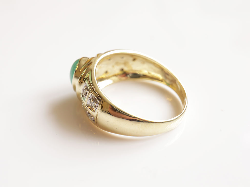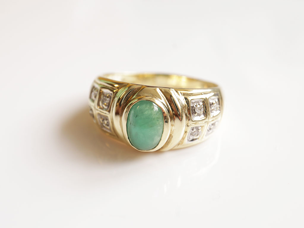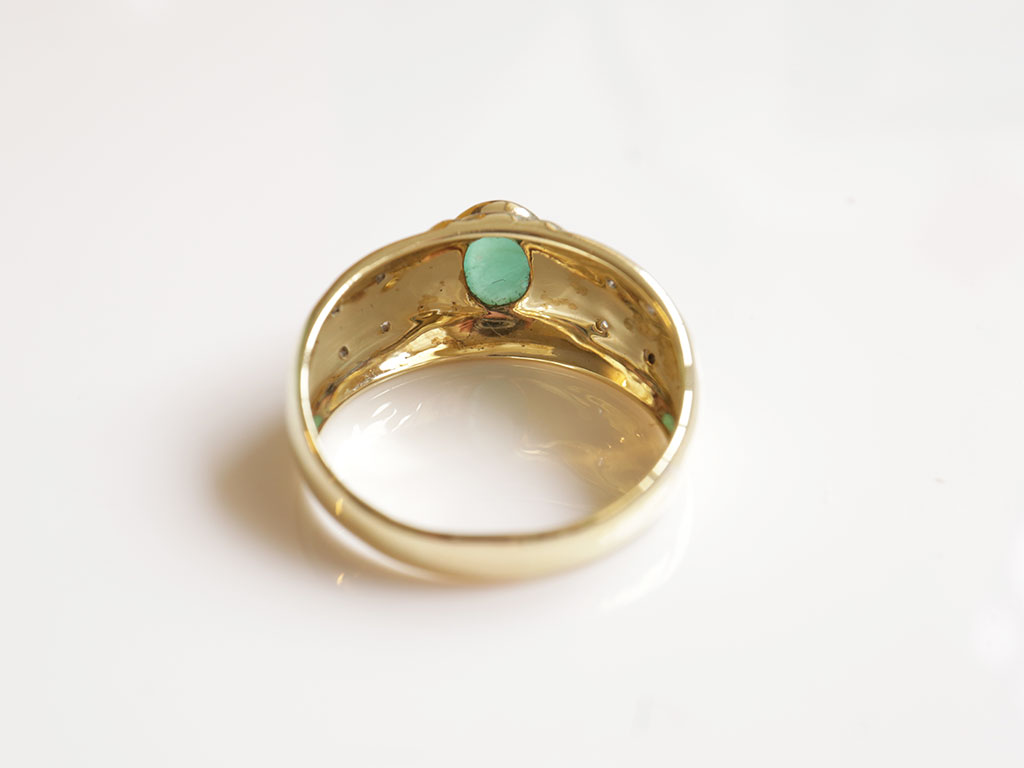 Een hele unieke ring waar we geen tweede van zien! Een mooi breed model met in het midden een cabochon geslepen licht groene edelsteen: de smaragd.