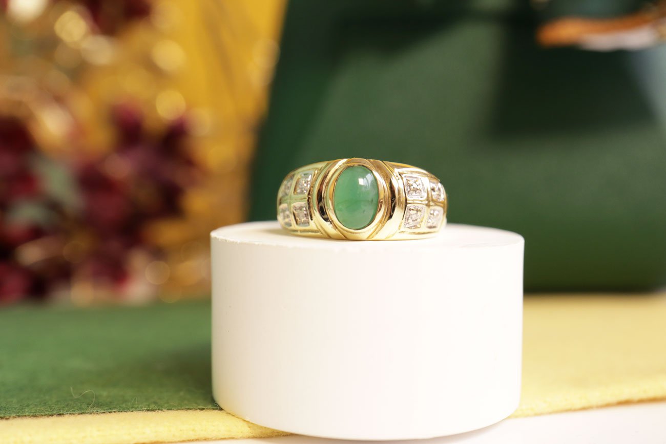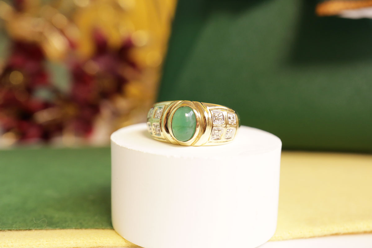 Deze vintage gouden dames ring is gemaakt van 14 karaat geelgoud en is een echte statement ring! De ring is gezet met een prachtige donkergroene Jade edelsteen, met daaromheen een schitterende bewerking.